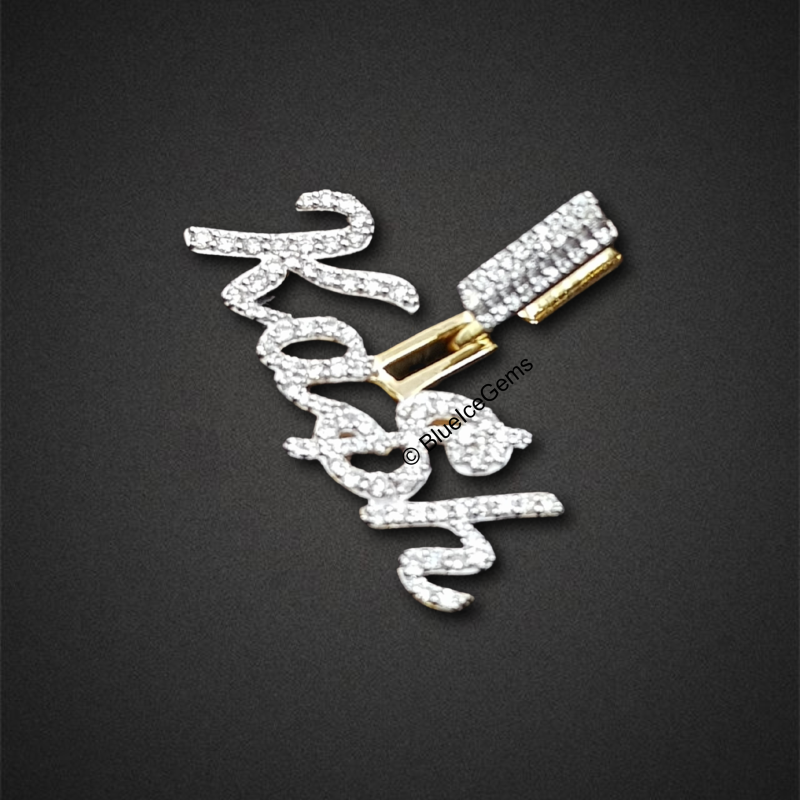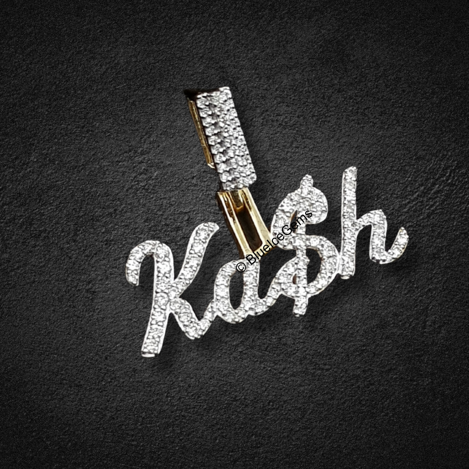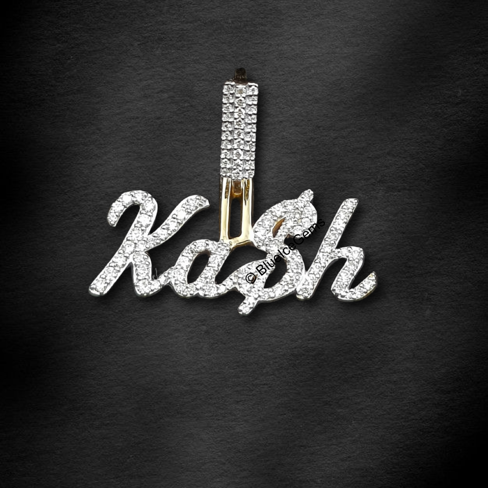 A dazzling “Kash” name pendant, exquisitely crafted in flowing script and entirely pave-set with brilliant white diamonds, accented with a touch of gold.