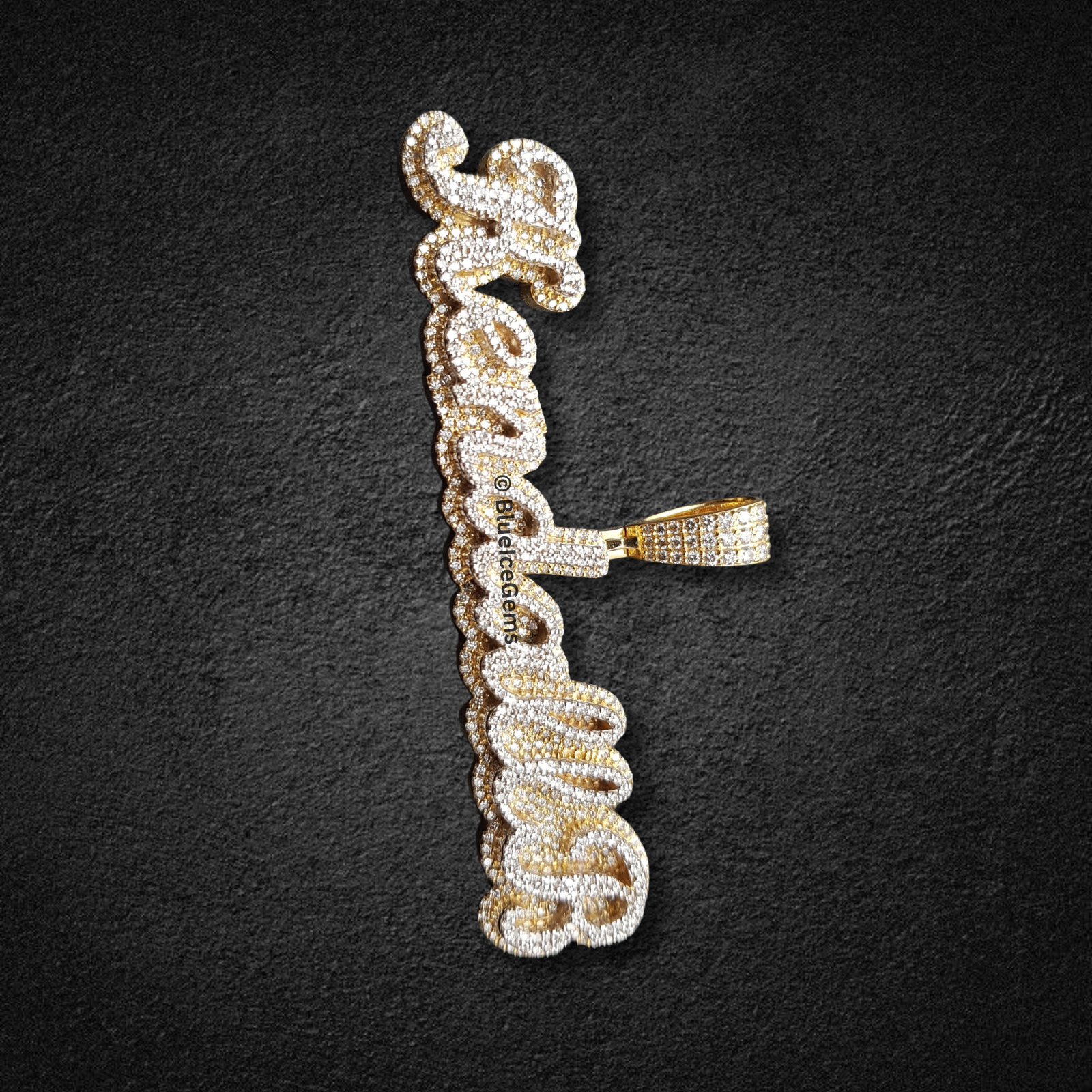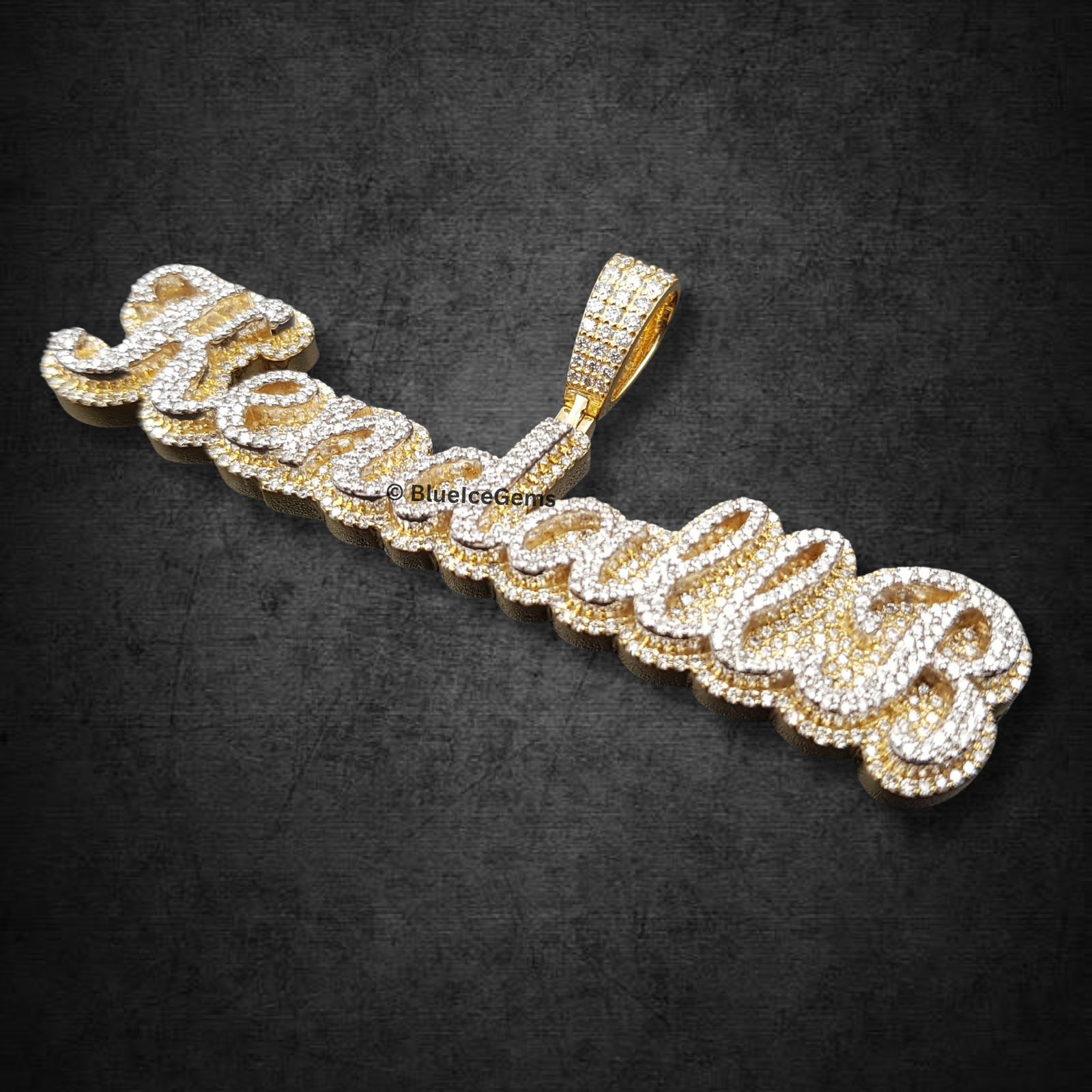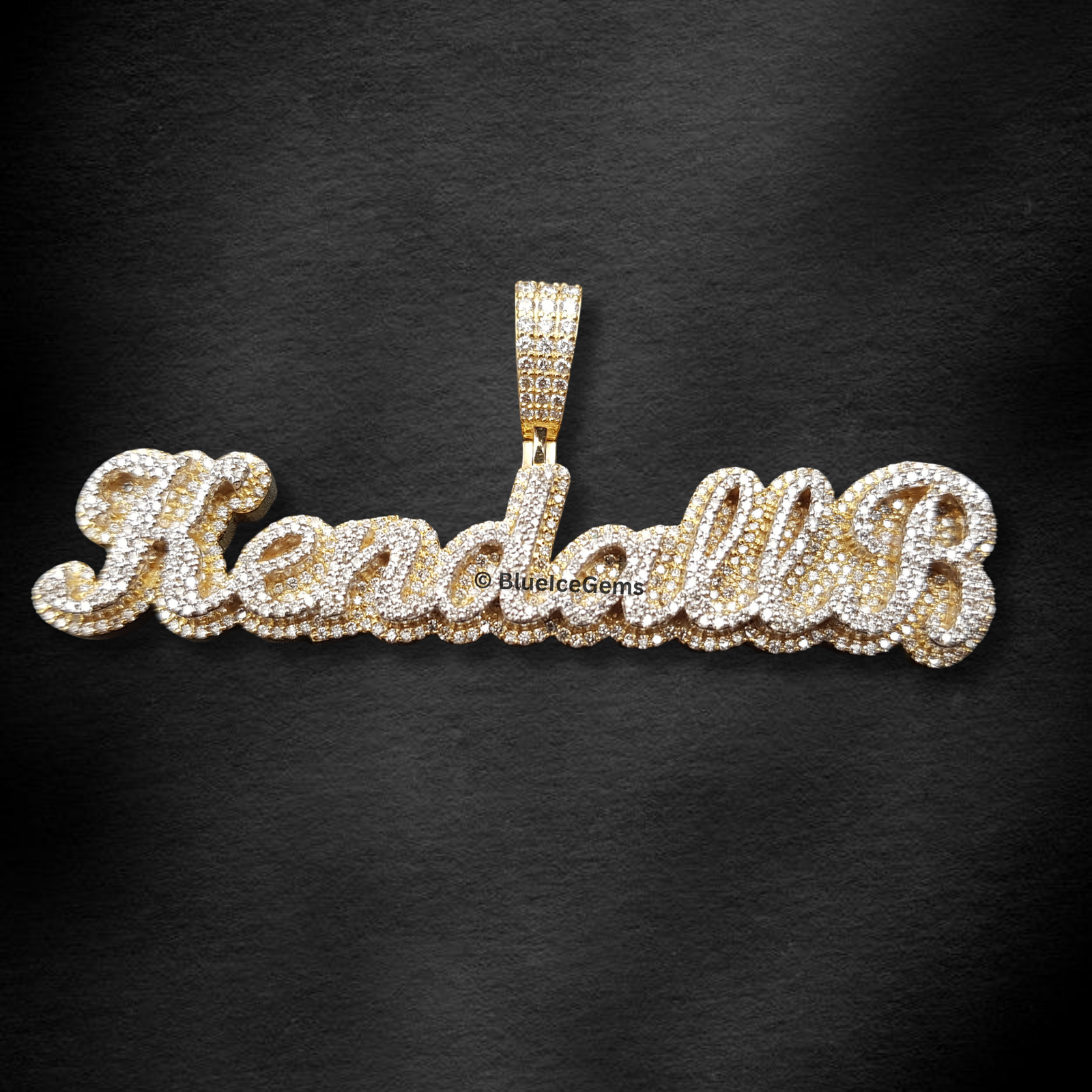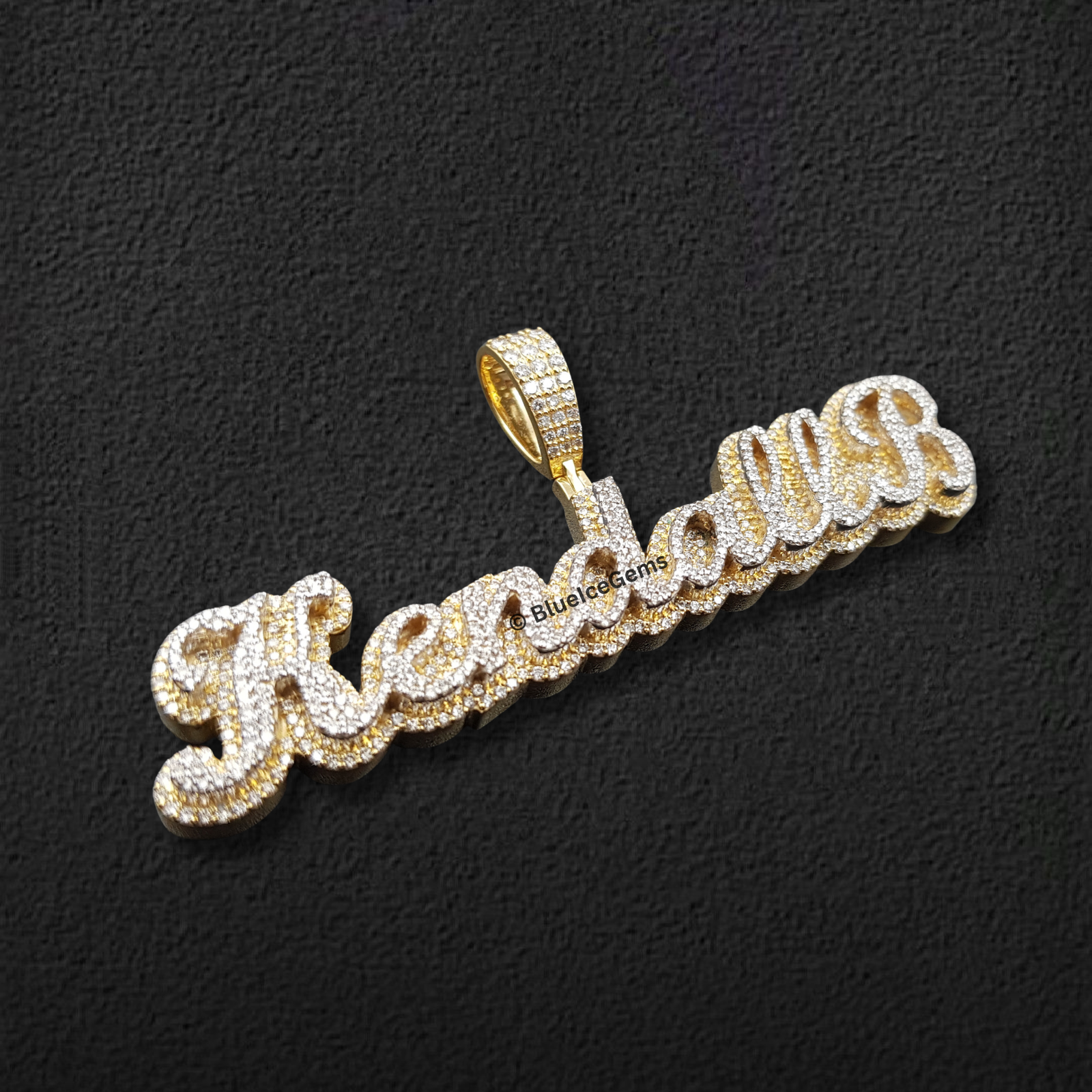 Celebrate a beloved name and personal connection with this truly captivating “Kendall B” script pendant, an exquisite creation from BlueIceGems. This extraordinary piece is meticulously pave-set with dazzling, brilliant white diamonds, ensuring that every graceful curve and line shimmers with an unbroken surface of pure fire and unparalleled scintillation. The brilliance radiates from every angle, making a remarkable statement. The elegant script of the name is beautifully outlined in warm, luxurious yellow gold, providing a sophisticated contrast that enhances the diamonds’ icy sparkle and adds a touch of opulent charm. This isn’t just a pendant; it’s a timeless tribute to individuality, elegant style, and cherished connections, expertly designed to dazzle and become a treasured heirloom for years to come. Wear it as a radiant reflection of a special bond or personal identity.