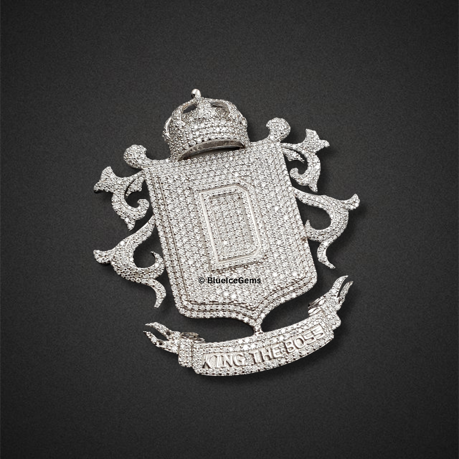 An imposing shield-shaped medallion, lavishly pave-set with diamonds, featuring a prominent “D” initial, crowned with a diamond diadem, and bearing a “KING THE BOSS” banner.