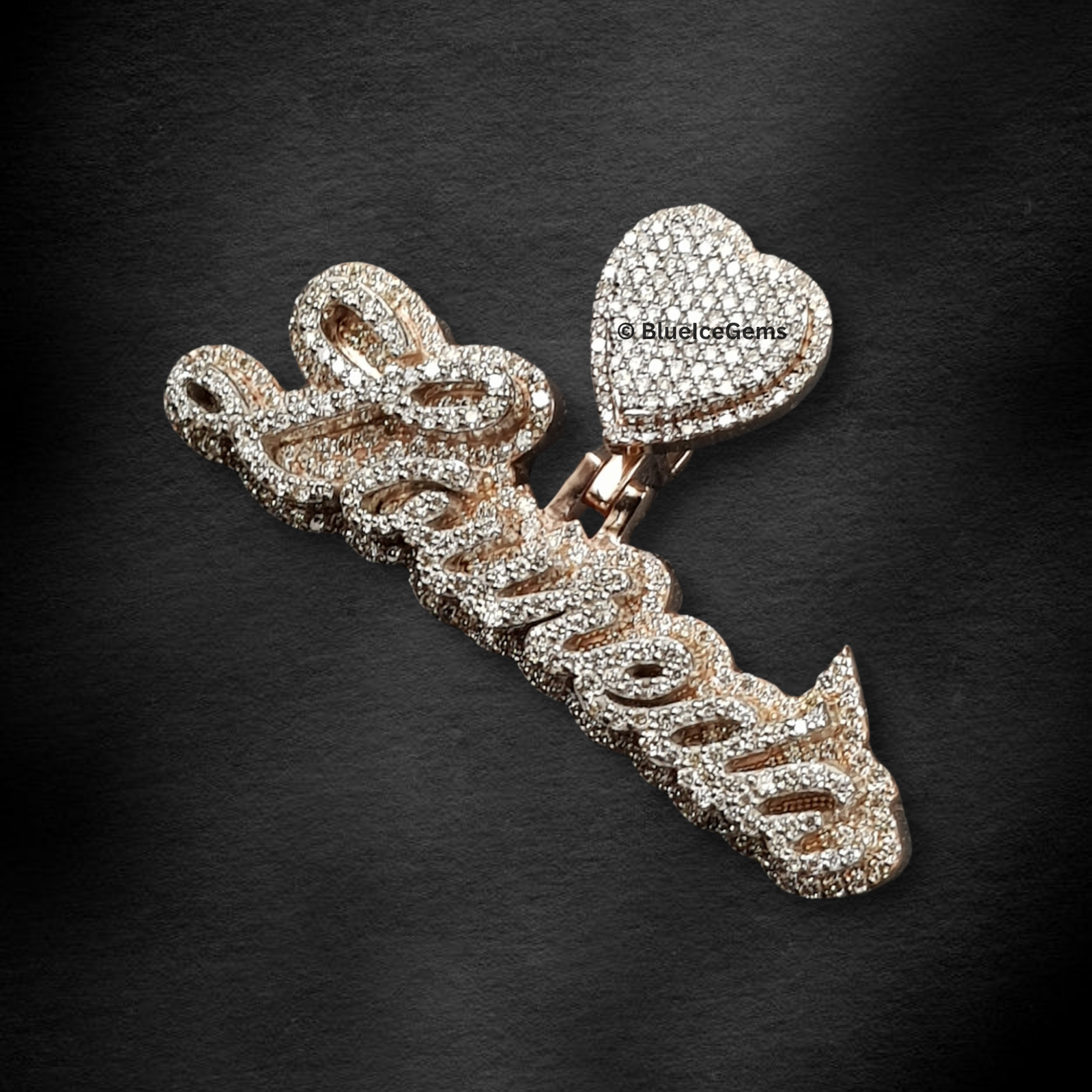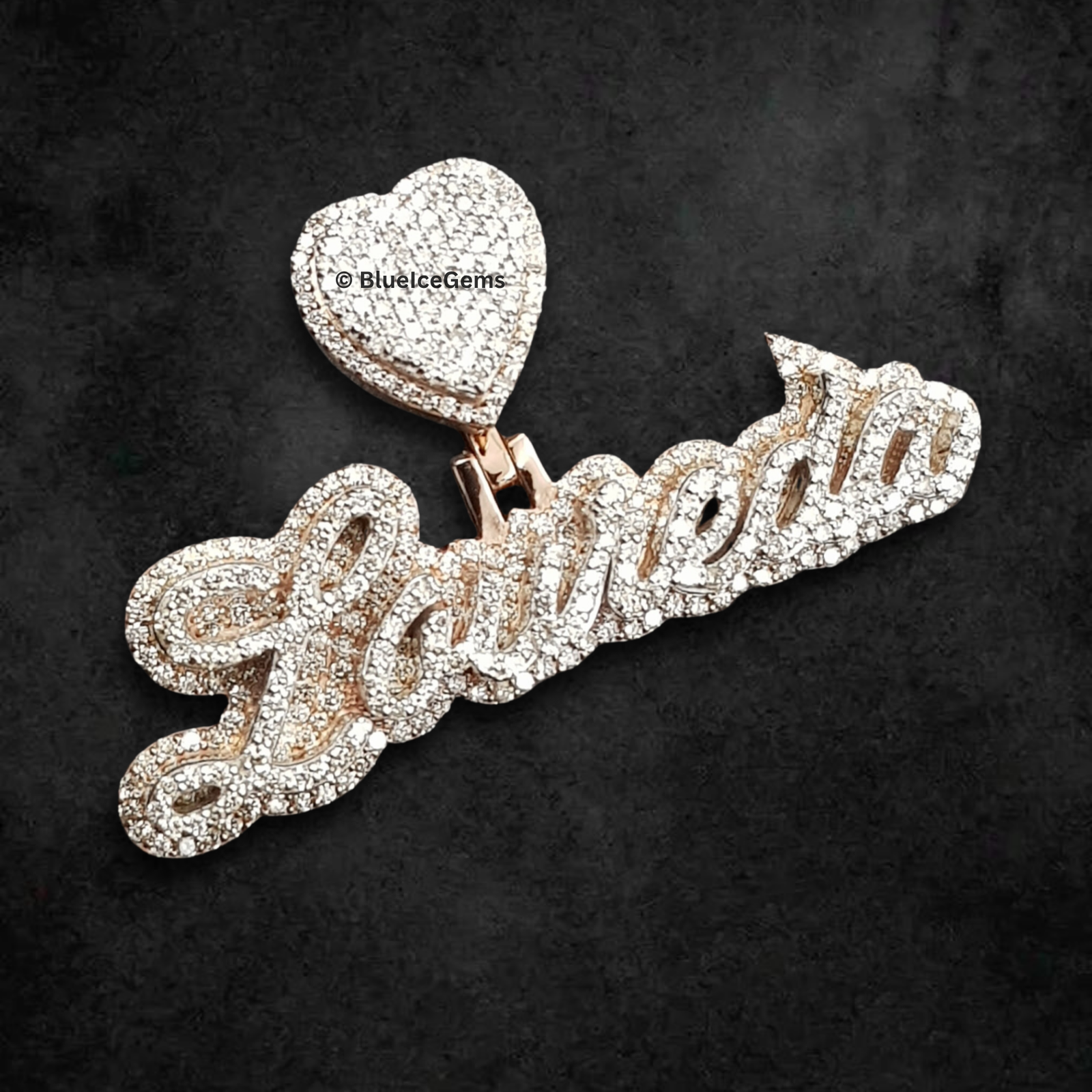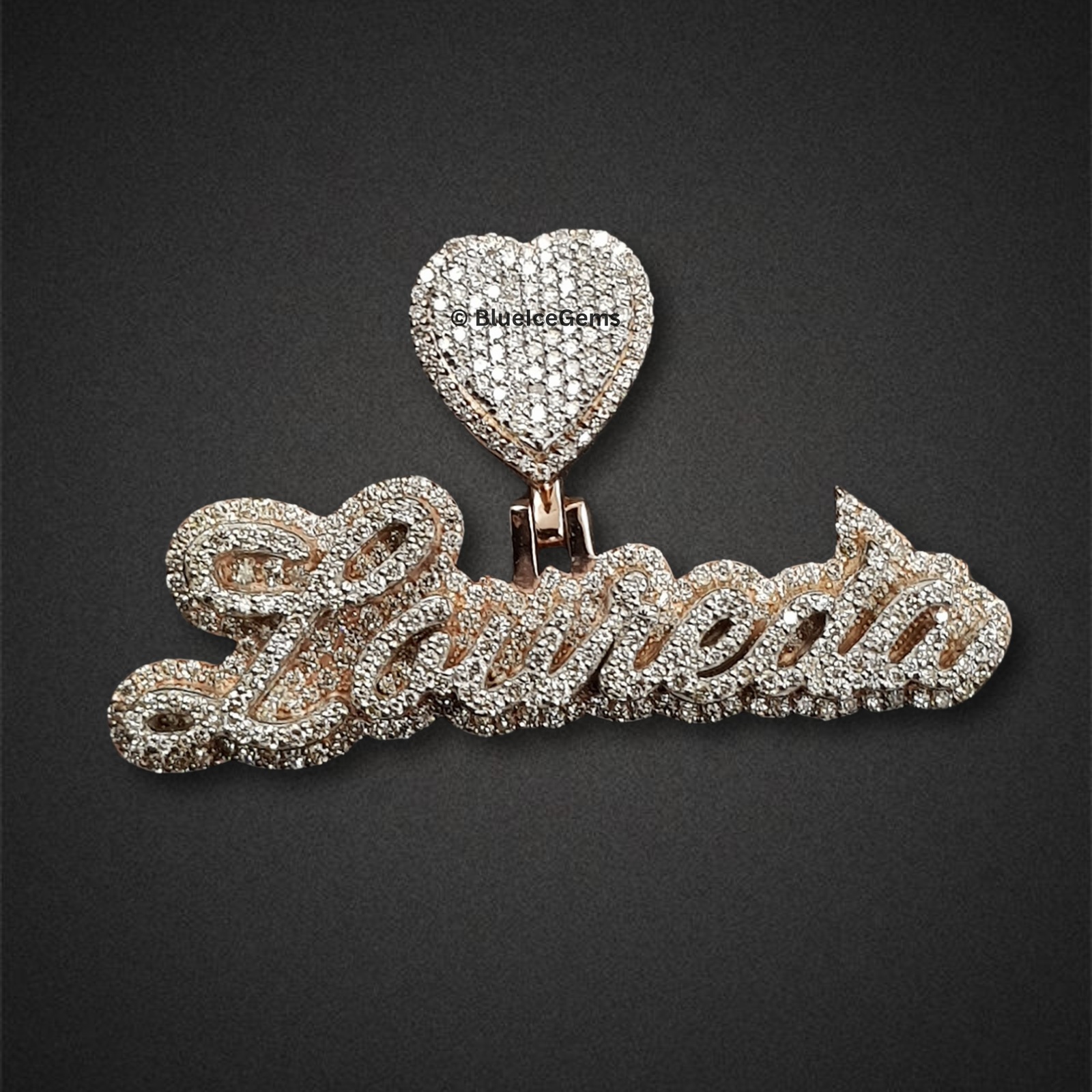 Celebrate a beloved name and profound connection with this enchanting “Laurenia” pendant, an exquisite creation from BlueIceGems. Elegantly crafted in a sophisticated flowing script, this pendant embodies grace and heartfelt individuality. Every graceful curve is meticulously pave-set with dazzling, brilliant white diamonds, ensuring an unbroken surface of pure fire and unparalleled scintillation. The diamonds’ radiant brilliance captures and reflects light from every conceivable angle, making a remarkable statement of sparkling luxury. To further amplify its deep meaning, this pendant is magnificently crowned with a sparkling diamond heart, symbolizing enduring love and cherished connections. The entire design is beautifully framed in warm, luxurious rose gold, providing a rich, romantic contrast that enhances the diamonds’ icy sparkle and adds to its opulent appeal. This isn’t just a pendant; it’s a timeless tribute to individuality, elegant style, and heartfelt bonds, expertly designed to dazzle and become a treasured heirloom for years to come.