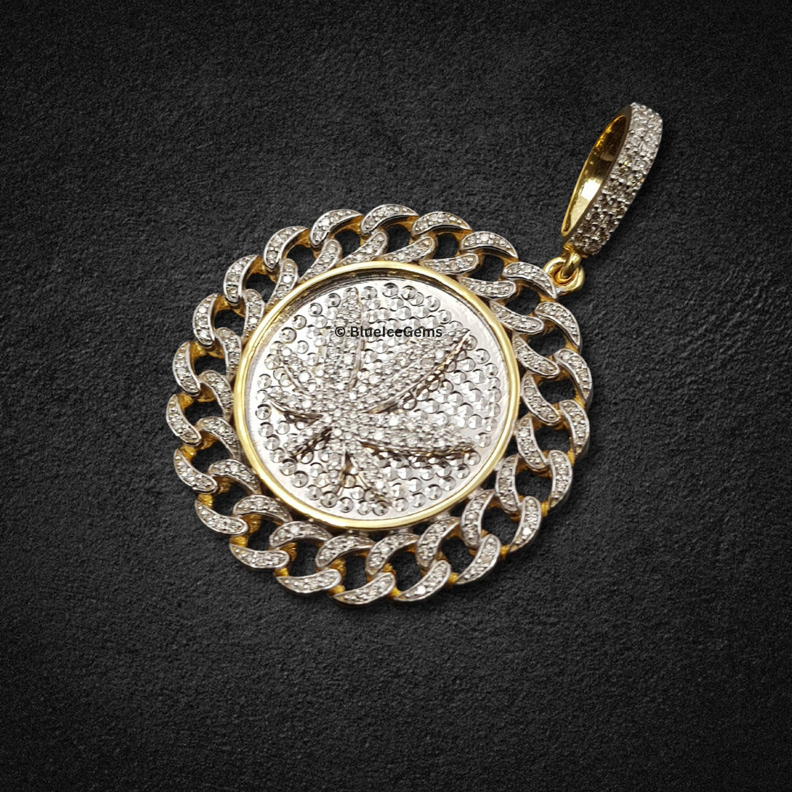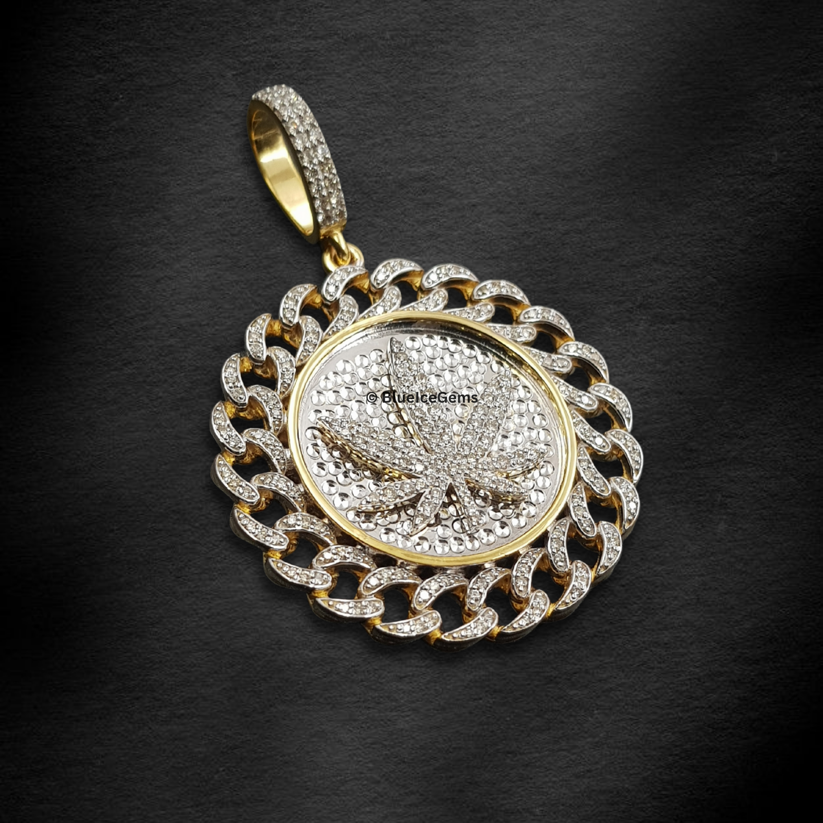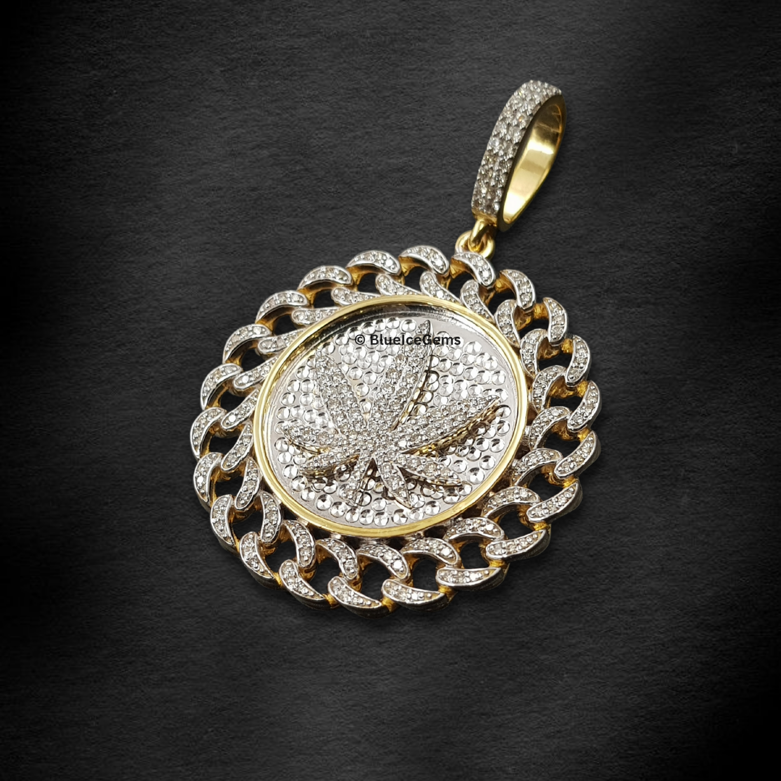 A captivating circular medallion featuring a prominent diamond-paved cannabis leaf, set against a pave diamond background, encircled by a dazzling yellow gold Cuban link chain, with a diamond-studded bail.
