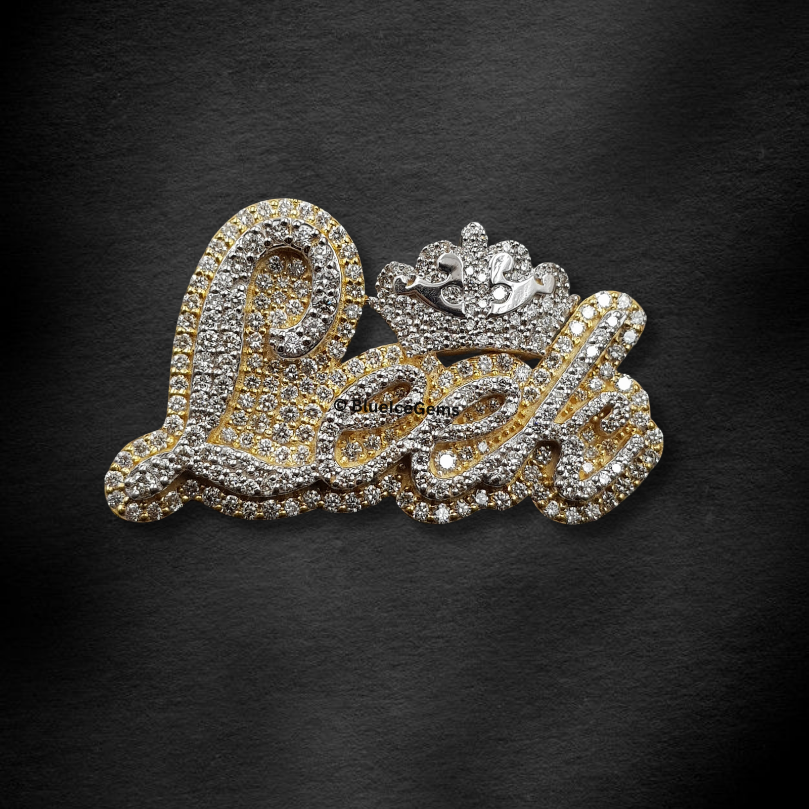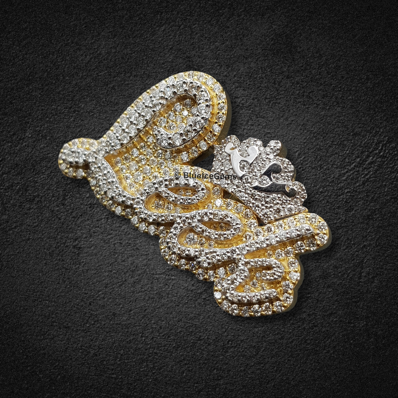 Declare your undeniable dominance and assert your authority with this majestic “Boss” script pendant, an extraordinary creation exclusively from BlueIceGems. This magnificent piece is meticulously pave-set with dazzling, brilliant white diamonds, ensuring every elegant curve and line shimmers with an unbroken surface of pure fire and unparalleled scintillation that radiates captivating light from every angle. The bold, commanding script of the word “Boss” is elegantly outlined in warm, luxurious yellow gold, providing a rich contrast that dramatically enhances the diamonds’ icy brilliance and adds to its opulent appeal. To further amplify its profound symbolism, a miniature, precisely detailed, fully diamond-studded crown sits triumphantly atop the pendant, unequivocally symbolizing power, leadership, and unparalleled luxury. This isn’t just a piece of fine jewelry; it’s a truly commanding and unique statement, embodying your ambition, success, and unyielding presence.