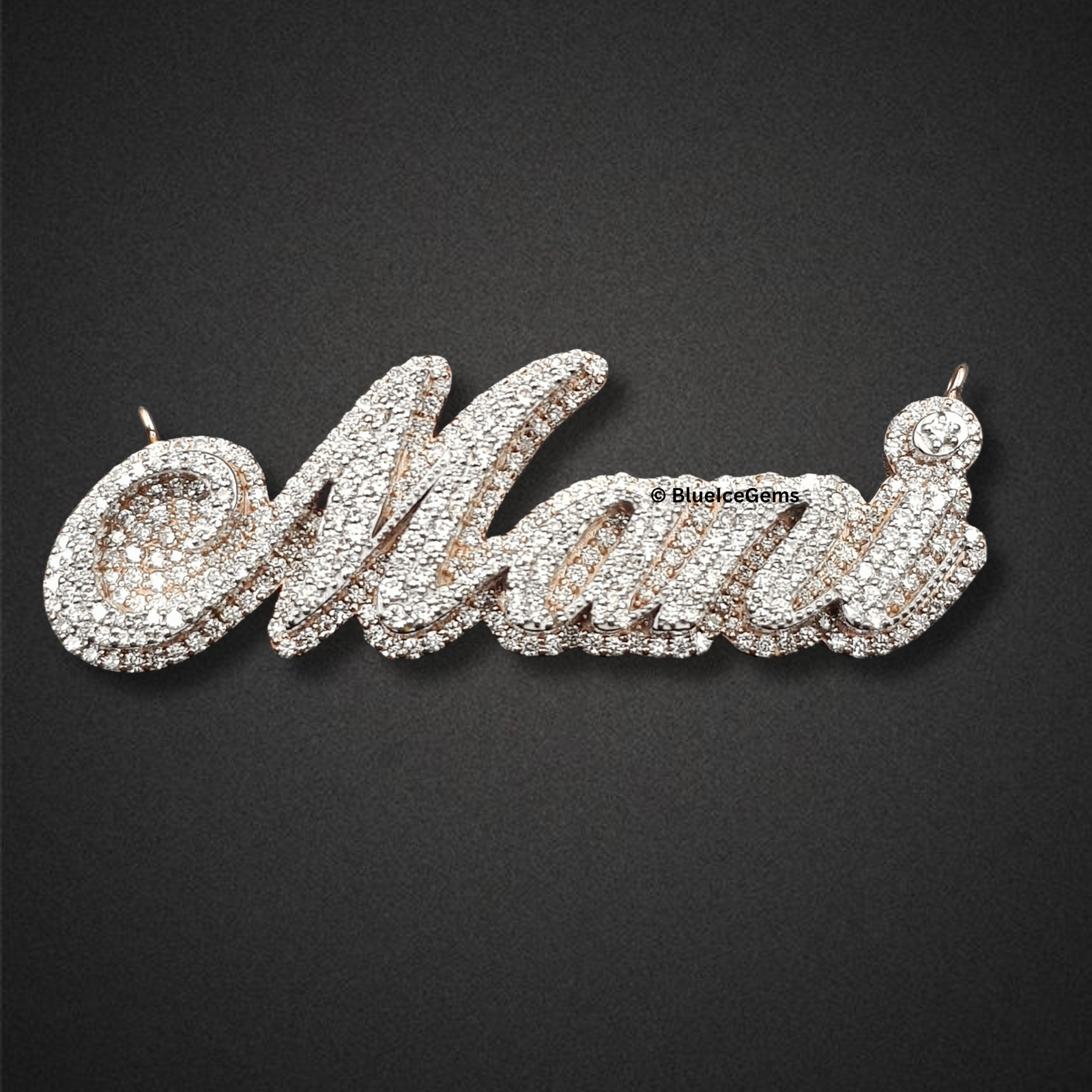 Celebrate a beloved name and express your unique style with The “Mani” Diamond Signature Script Pendant, a truly enchanting piece that combines personalized sentiment with radiant luxury from BlueIceGems. This captivating custom pendant elegantly spells out “Mani” in a graceful, flowing handwritten script font, embodying a unique touch of individuality and charm. Every delicate curve and flourish of the name is meticulously pave-set with an astonishing array of brilliant-cut white diamonds, creating an unbroken surface of pure fire and unparalleled scintillation. The sheer density of diamonds ensures it catches and reflects light with breathtaking brilliance from every angle, radiating pure sparkle. This isn’t just a pendant; it’s a timeless and luxurious tribute, designed to sparkle with uncompromised brilliance and undeniable charm.