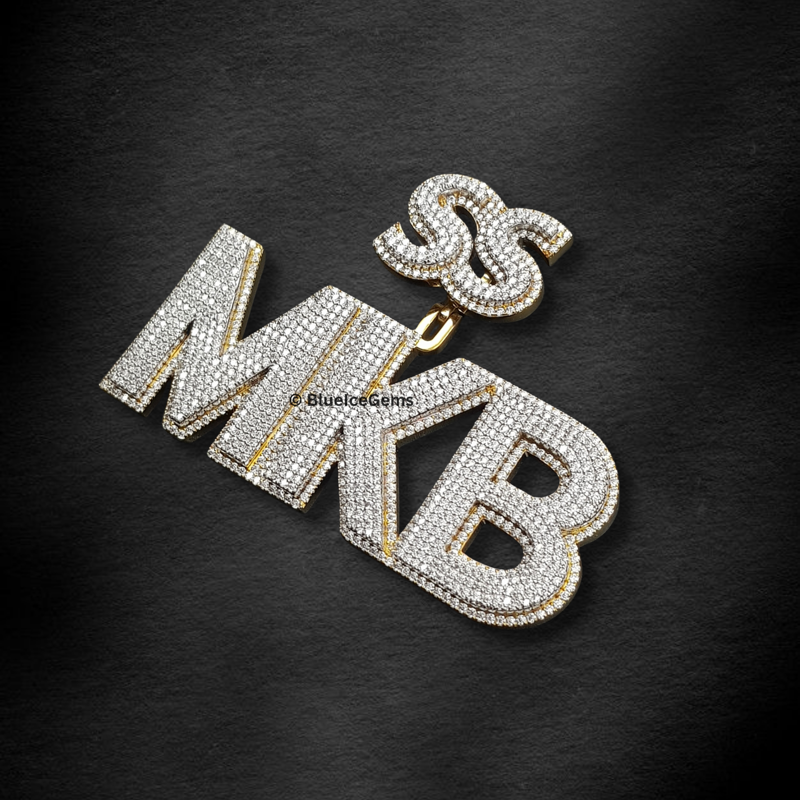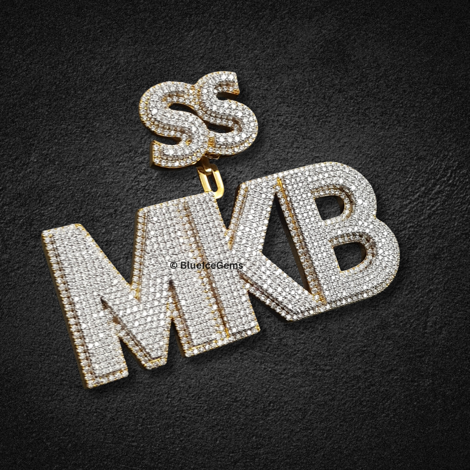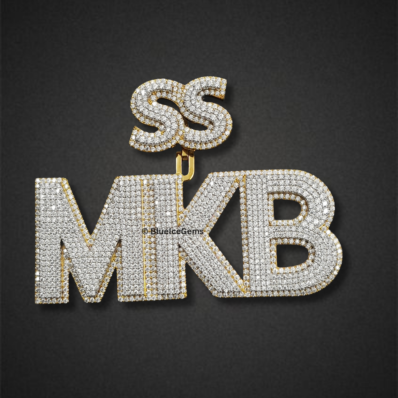 Command attention and make a truly monumental statement with this extraordinary “MKB” pendant, an exclusive creation from BlueIceGems. This magnificent piece is entirely and meticulously blanketed in dazzling, brilliant white diamonds, each gem expertly set to create an unbroken, shimmering surface of pure fire and unparalleled scintillation that radiates captivating light from every angle. The robust, three-dimensional form of the initials is elegantly framed in gleaming yellow gold, providing a luxurious contrast that dramatically enhances the diamonds’ icy brilliance and adds to its opulent appeal. To further amplify its profound meaning and distinctive design, this pendant is uniquely crowned by a smaller, equally brilliant “SS” emblem. This personalized detail transforms the piece into a powerful symbol of personalized luxury, distinction, and undeniable identity. This isn’t just a piece of fine jewelry; it proudly exudes uncompromised sparkle and audacious personal style, perfect for those who wear their story with confidence and unparalleled brilliance.