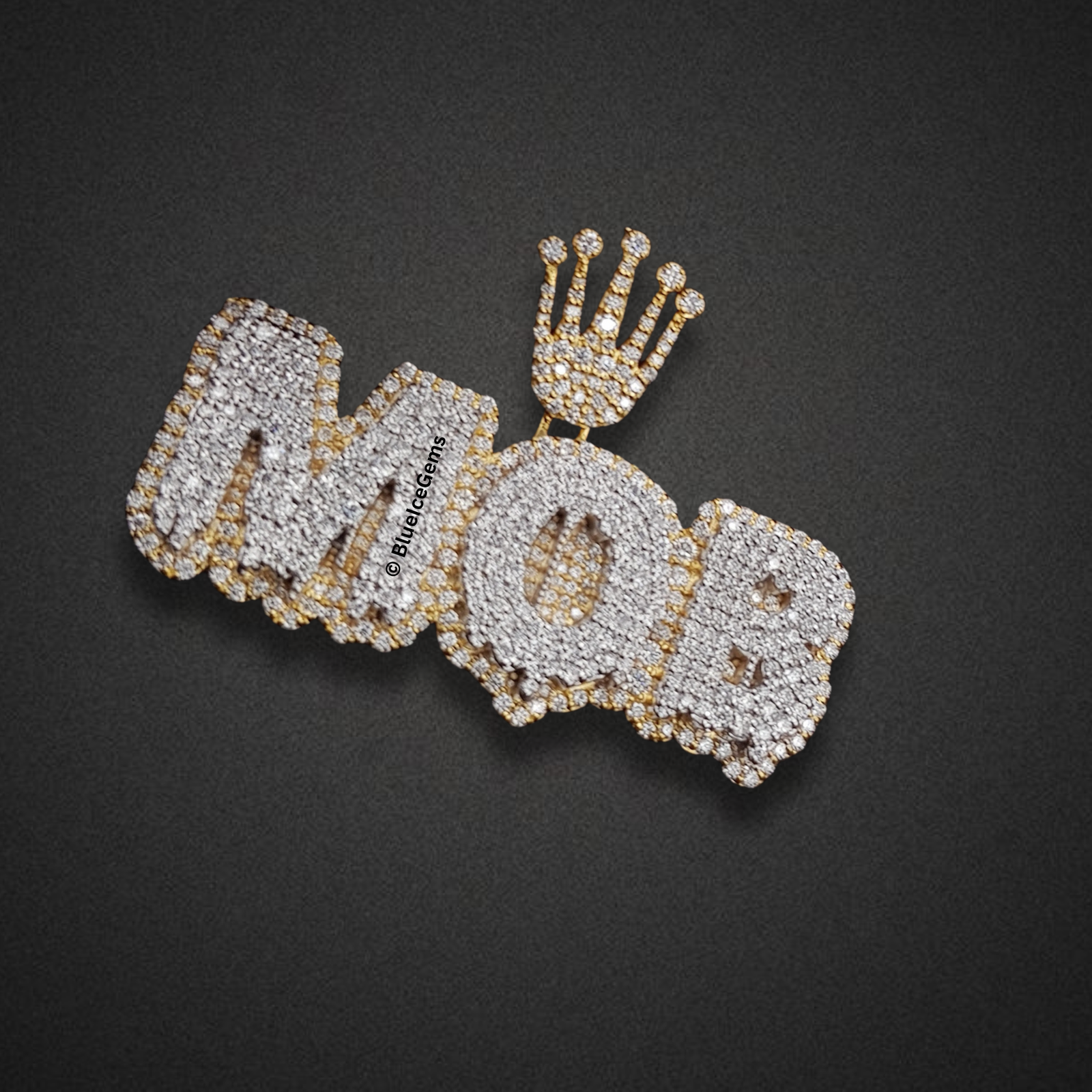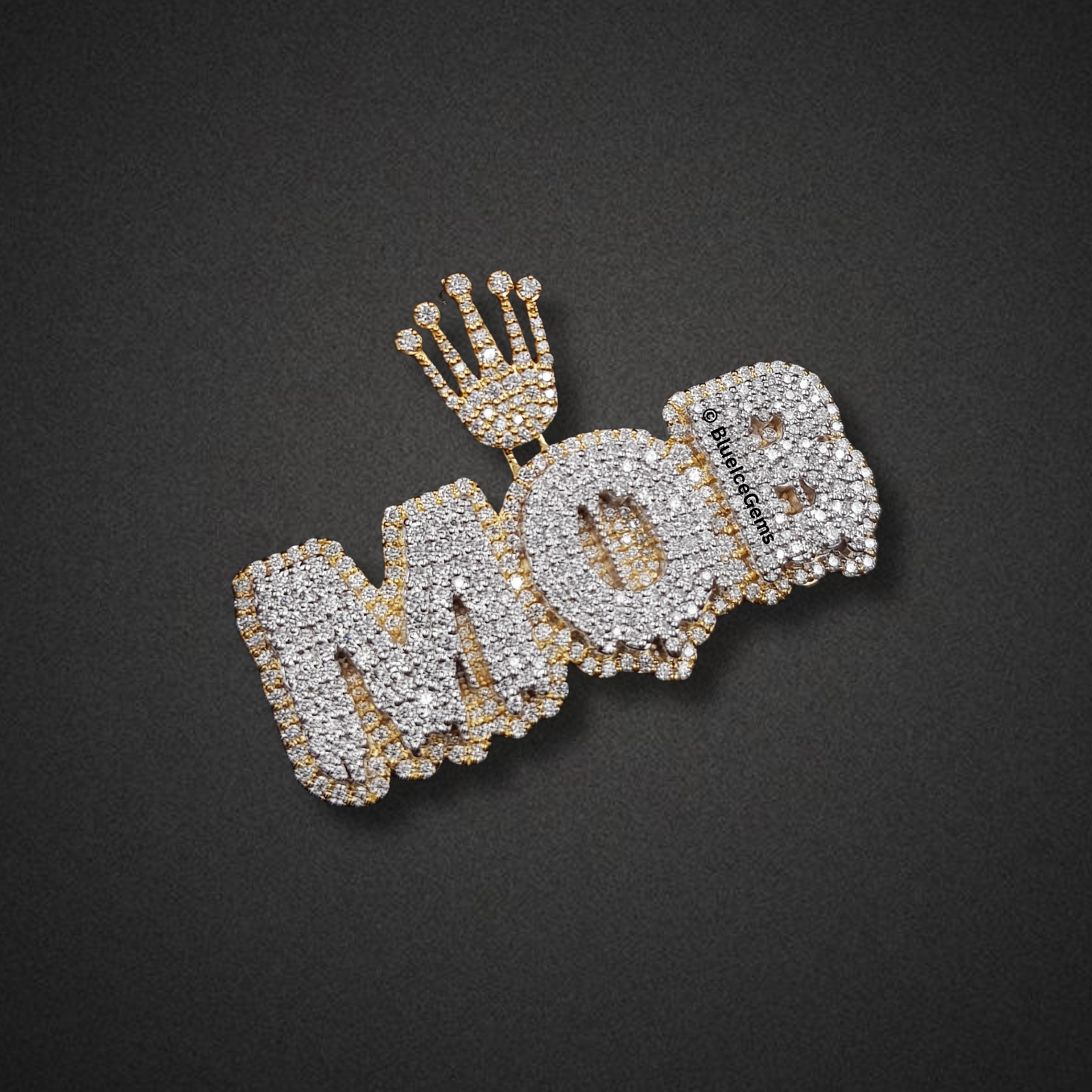 Declare your allegiance and personal reign with The “MOB” Crowned Diamond Statement Pendant, a truly magnificent and unapologetically brilliant piece designed to capture all attention. This impressive custom pendant features the bold “MOB” initials in a dynamic, three-dimensional form, meticulously crafted and lavishly adorned with an astonishing array of brilliant pave-set diamonds. Each diamond contributes to an uninterrupted surface of pure fire and scintillation, ensuring unparalleled brilliance that catches and reflects light from every conceivable angle. The robust form of the letters is elegantly outlined and backed by gleaming yellow gold, providing a rich, warm contrast that enhances the depth and luxurious appeal of the design. Crowning the central “O” is a miniature, diamond-studded royal diadem, symbolizing sovereignty, power, and uncompromised luxury. The integrated bail, also in coordinating yellow gold with diamond accents, ensures a secure and prominent display on your chosen chain. This pendant is more than just jewelry; it’s a powerful emblem of identity, aspiration, and unparalleled artistry.