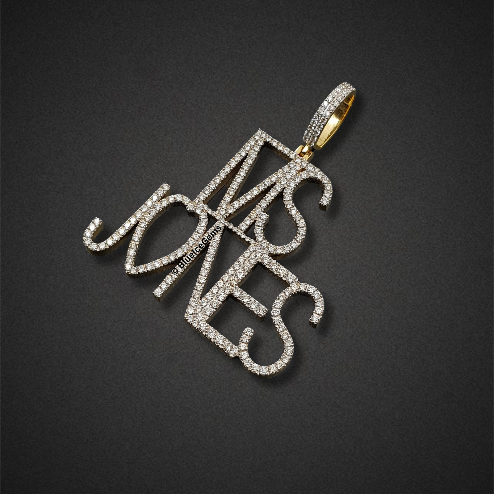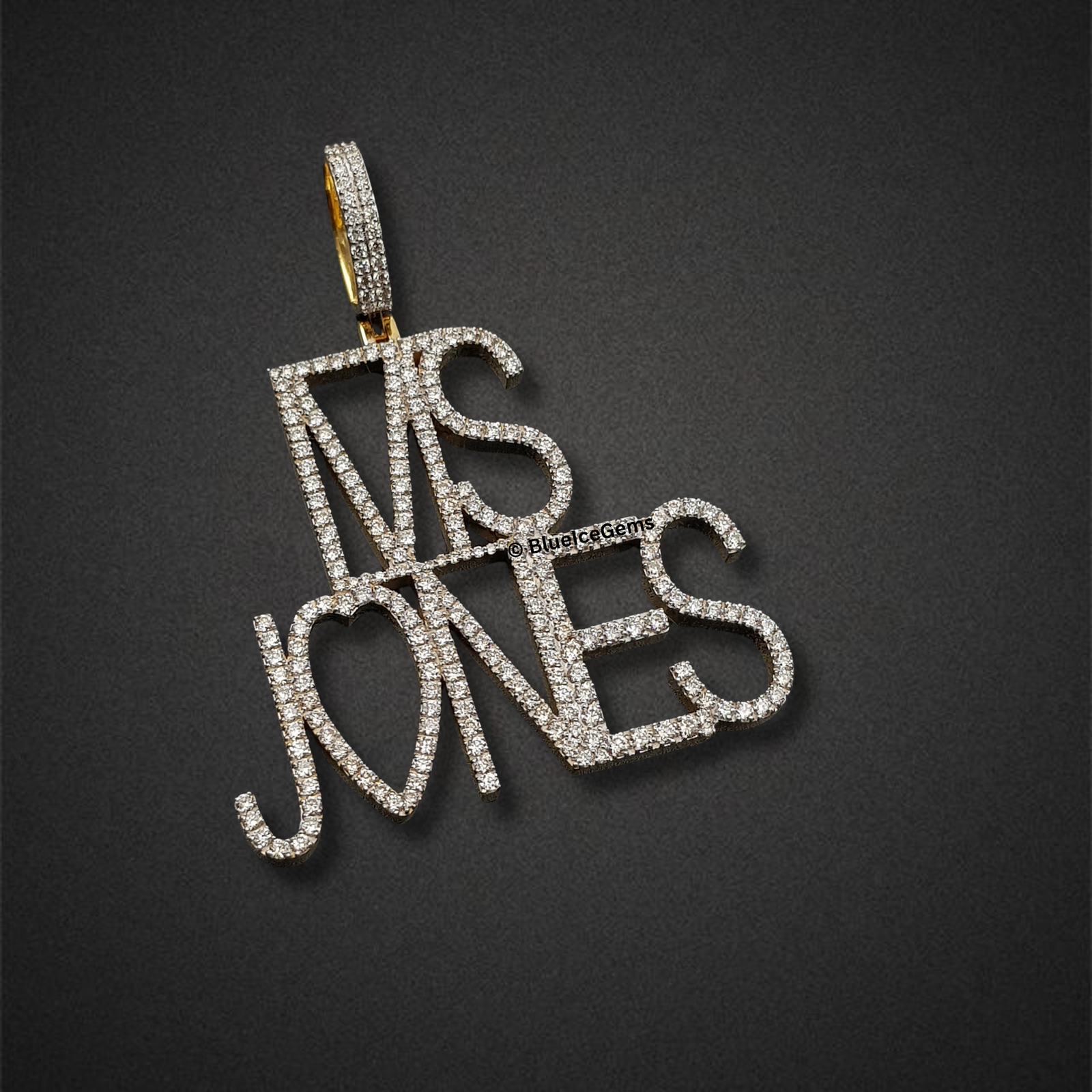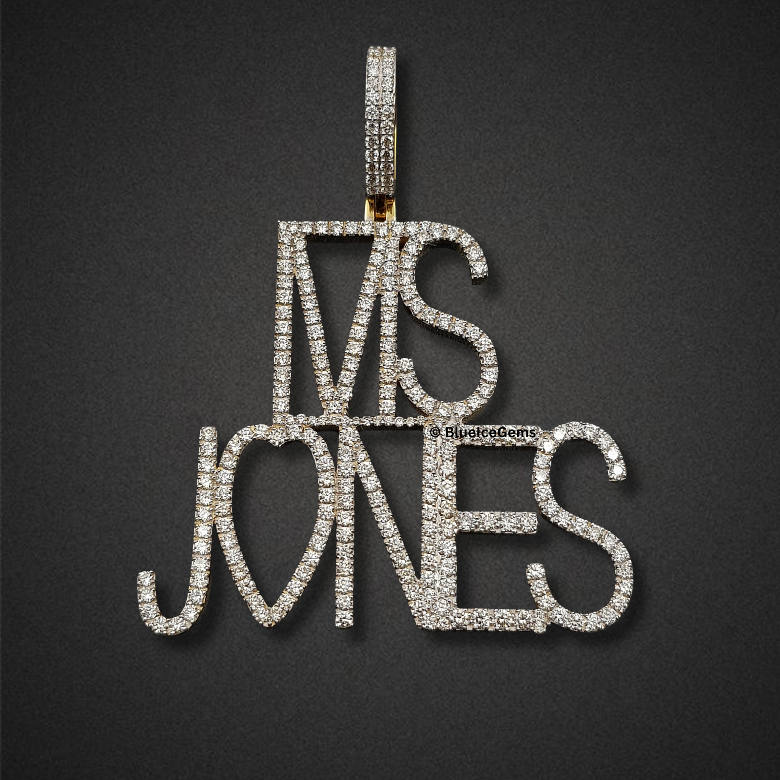 Celebrate a beloved name with The “Ms. Jones” Heartfelt Diamond Pendant, an exceptionally brilliant and personalized piece that exudes sophistication and sentiment. This impressive custom pendant elegantly spells out “MS. JONES” in prominent, impactful lettering, making a bold and personal statement. Every surface, from the crisp lines of “MS” to the flowing curves of “JONES,” is meticulously pave-set with an astonishing array of brilliant-cut white diamonds. The sheer density of diamonds creates an unbroken surface of pure fire and unparalleled scintillation, ensuring it catches and reflects light with breathtaking brilliance from every angle. This isn’t just a pendant; it’s a timeless and luxurious tribute, designed to be worn close to the heart as a symbol of cherished connections and exquisite taste.