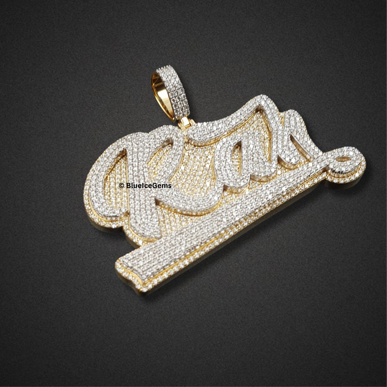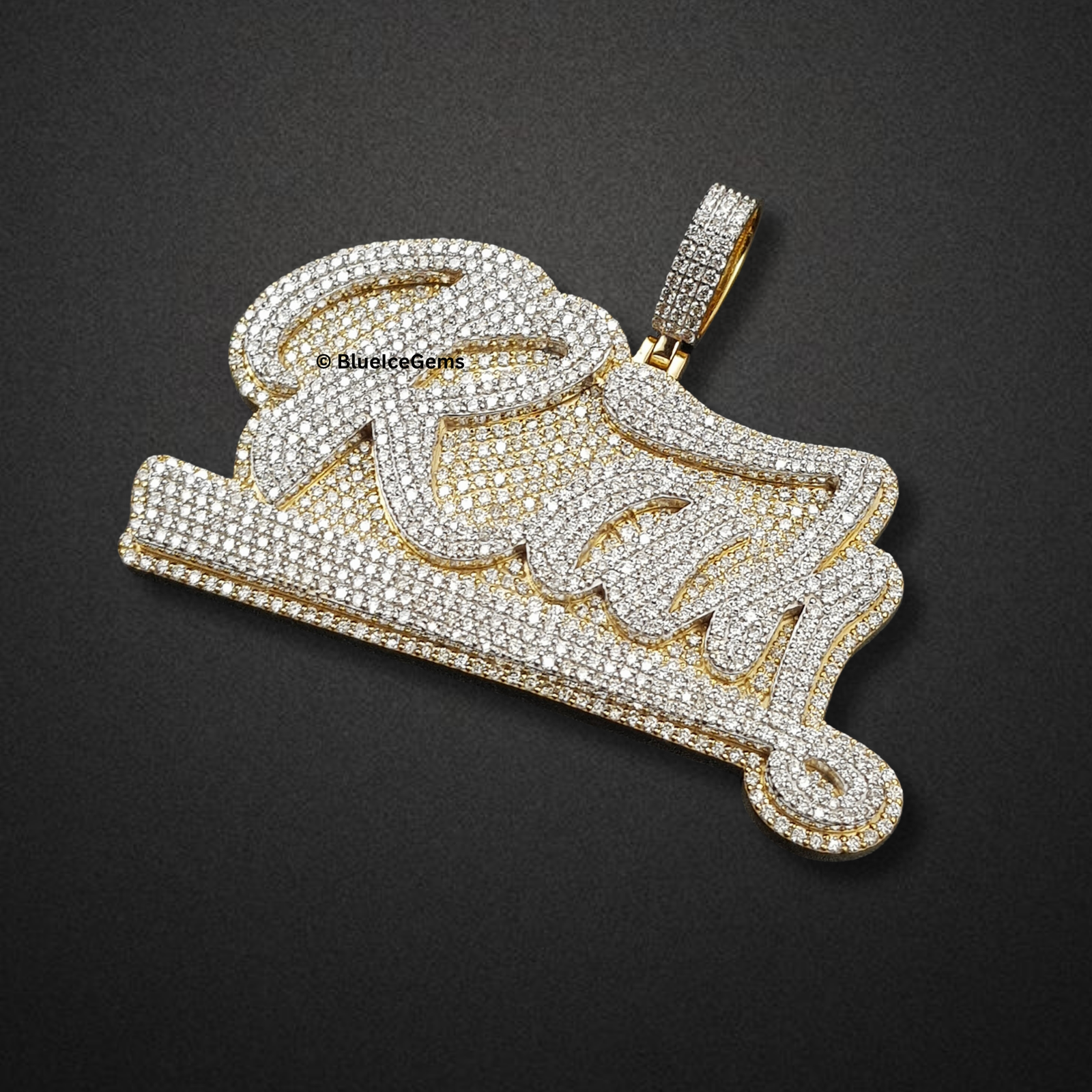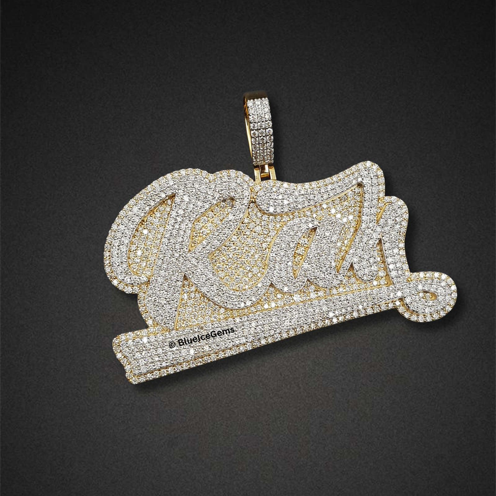 Declare your prosperity and ambition with The “Rak” Diamond Statement Pendant, an incredibly opulent and eye-catching piece designed to command attention. This formidable custom pendant boldly spells out “Rak” in a dynamic, three-dimensional script, giving it remarkable depth and presence. Every contour and curve of the name is meticulously pave-set with an astonishing array of brilliant-cut white diamonds, creating an unbroken surface of pure fire and unparalleled scintillation. The sheer density of diamonds ensures it catches and reflects light with breathtaking brilliance from every angle, radiating pure sparkle. This isn’t just a pendant; it’s a powerful and luxurious emblem, designed to be a radiant testament to your drive and uncompromised style.