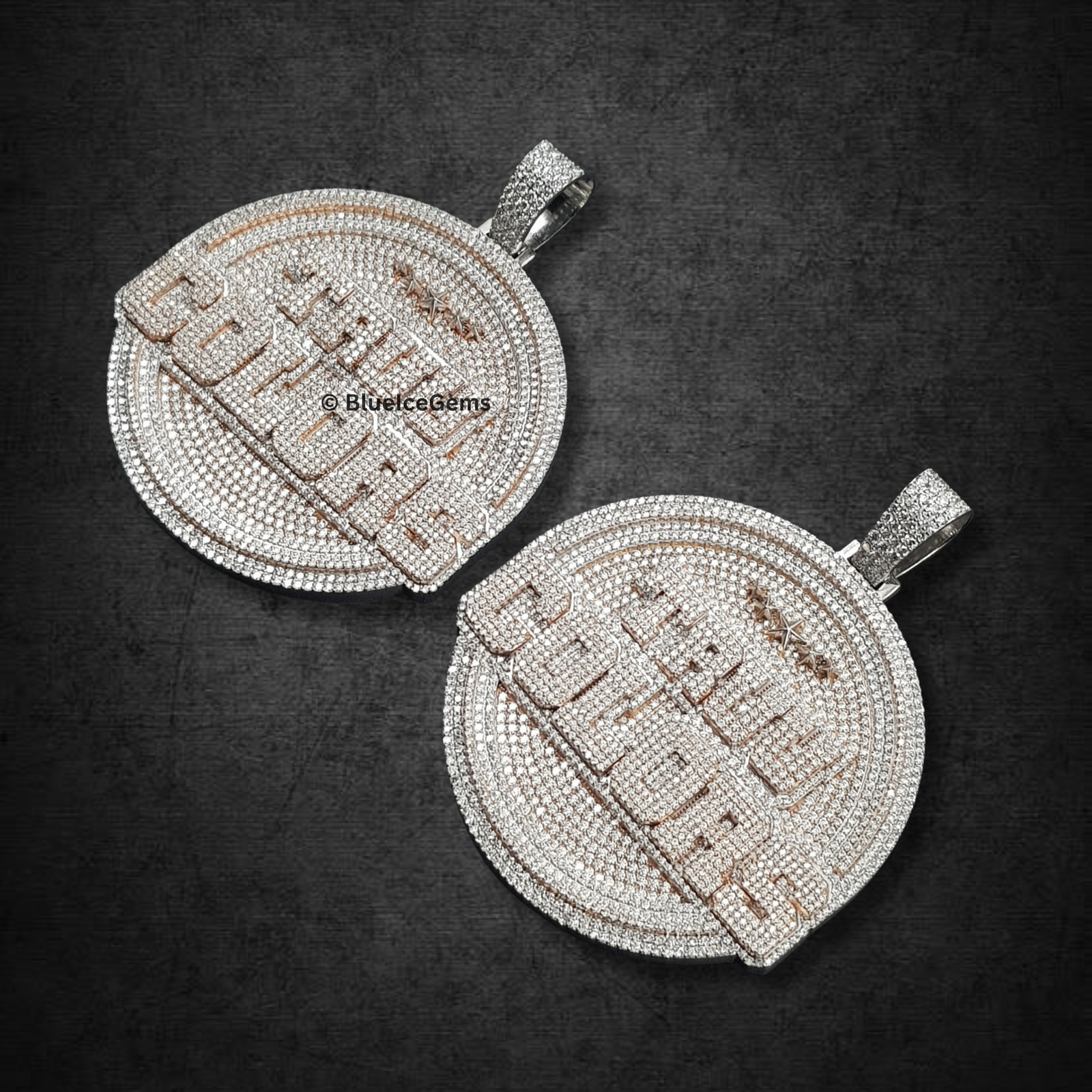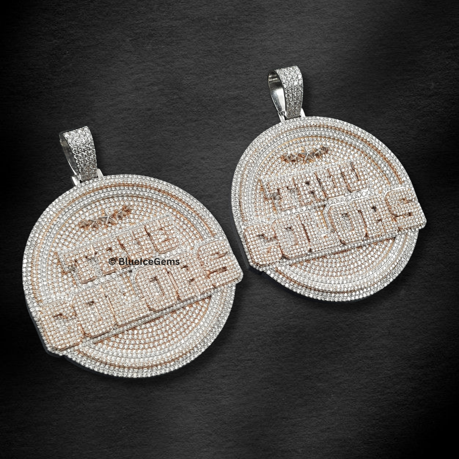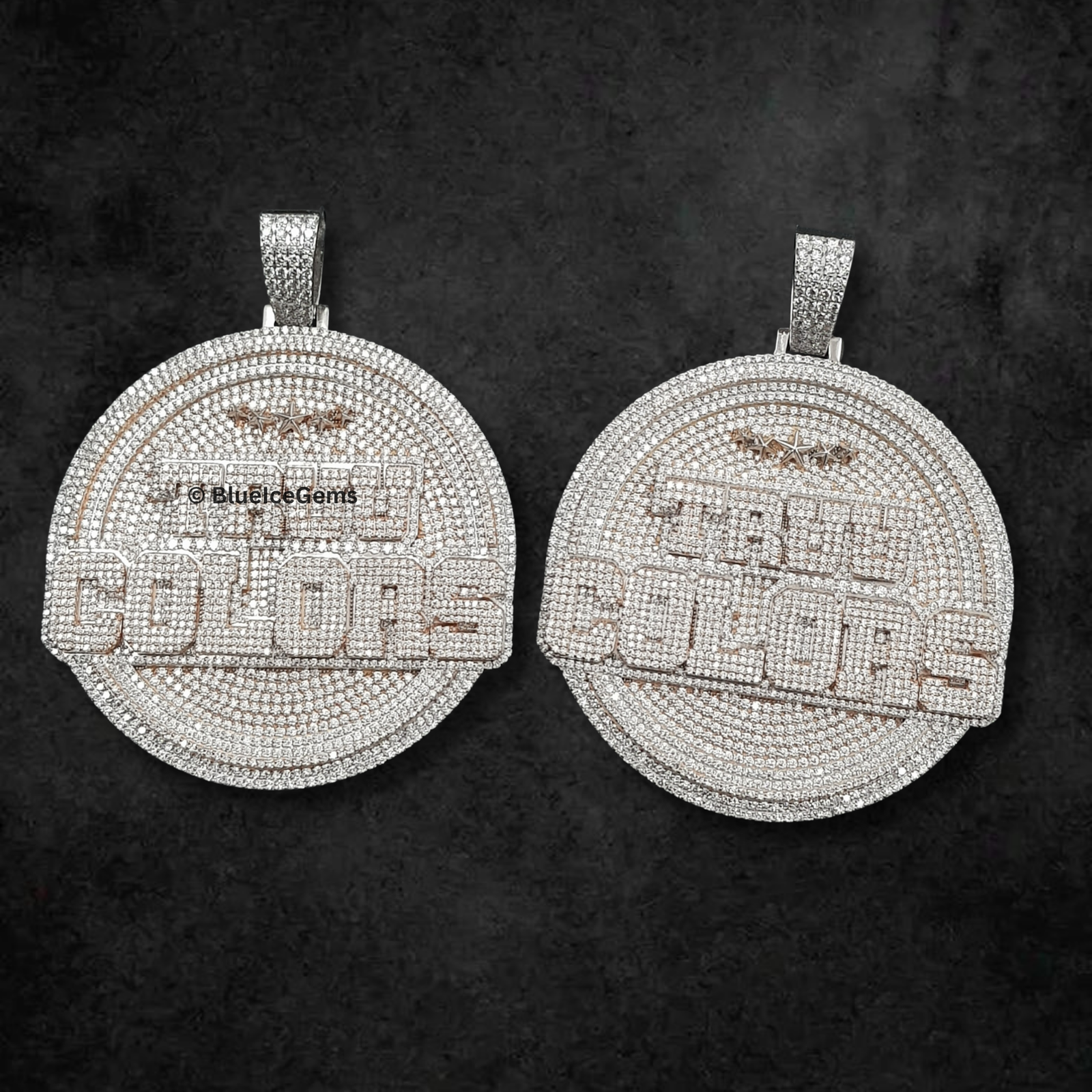 & Free ShippingA dazzling pair of circular medallions, fully iced out with white diamonds, showcasing “REAL COLORS” in diamond lettering, with a star emblem, framed in rose gold, for bold and authentic statements.