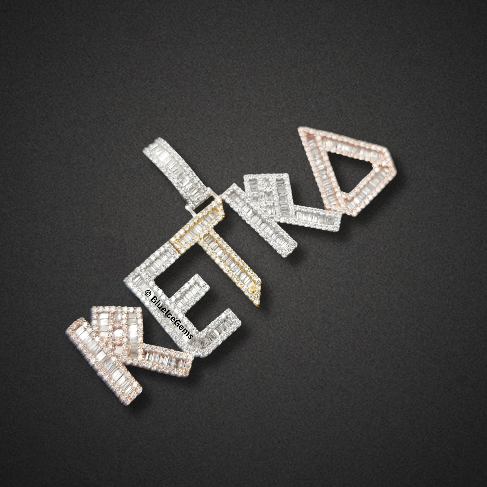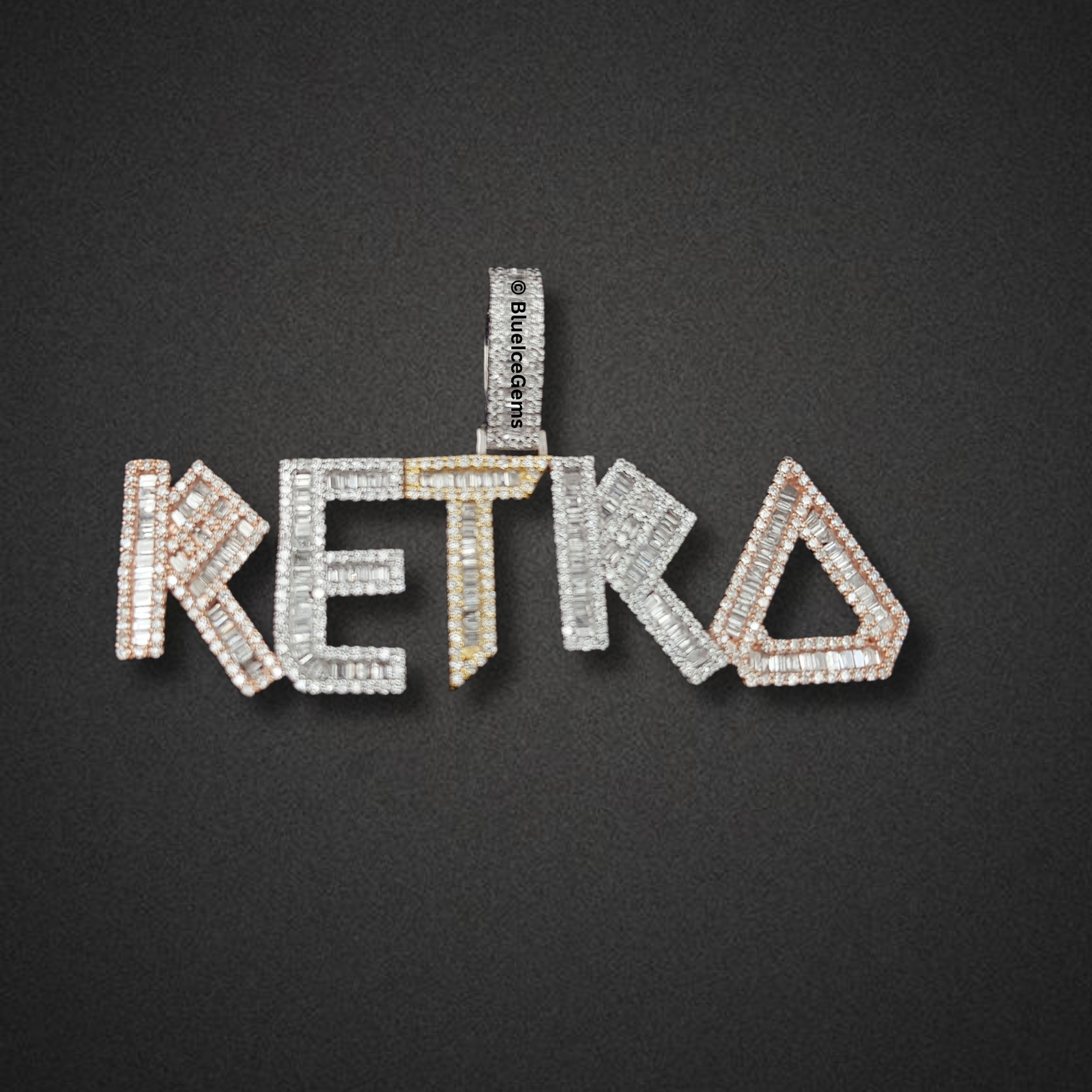 Command attention with The “RETRO” Diamond Baguette Statement Pendant, a truly formidable and visually captivating piece meticulously crafted to exude unparalleled brilliance and audacious style. This impressive custom pendant features the bold letters “RETRO” in a dynamic, multi-faceted design. Each letter is lavishly adorned with an astonishing array of crisp baguette-cut diamonds, creating striking linear brilliance that catches and reflects light with breathtaking intensity from every conceivable angle. The unique design incorporates a compelling blend of rose gold and yellow gold outlines, providing a sophisticated contrast that enhances the depth and luxurious appeal of the design. The robust, diamond-studded bail, also in a complementary gold tone, ensures a secure and prominent display on your chosen chain. This pendant is more than just jewelry; it’s a powerful emblem of identity, distinctive style, and uncompromised luxury, meticulously designed for those who demand attention and appreciate the pinnacle of custom diamond artistry.