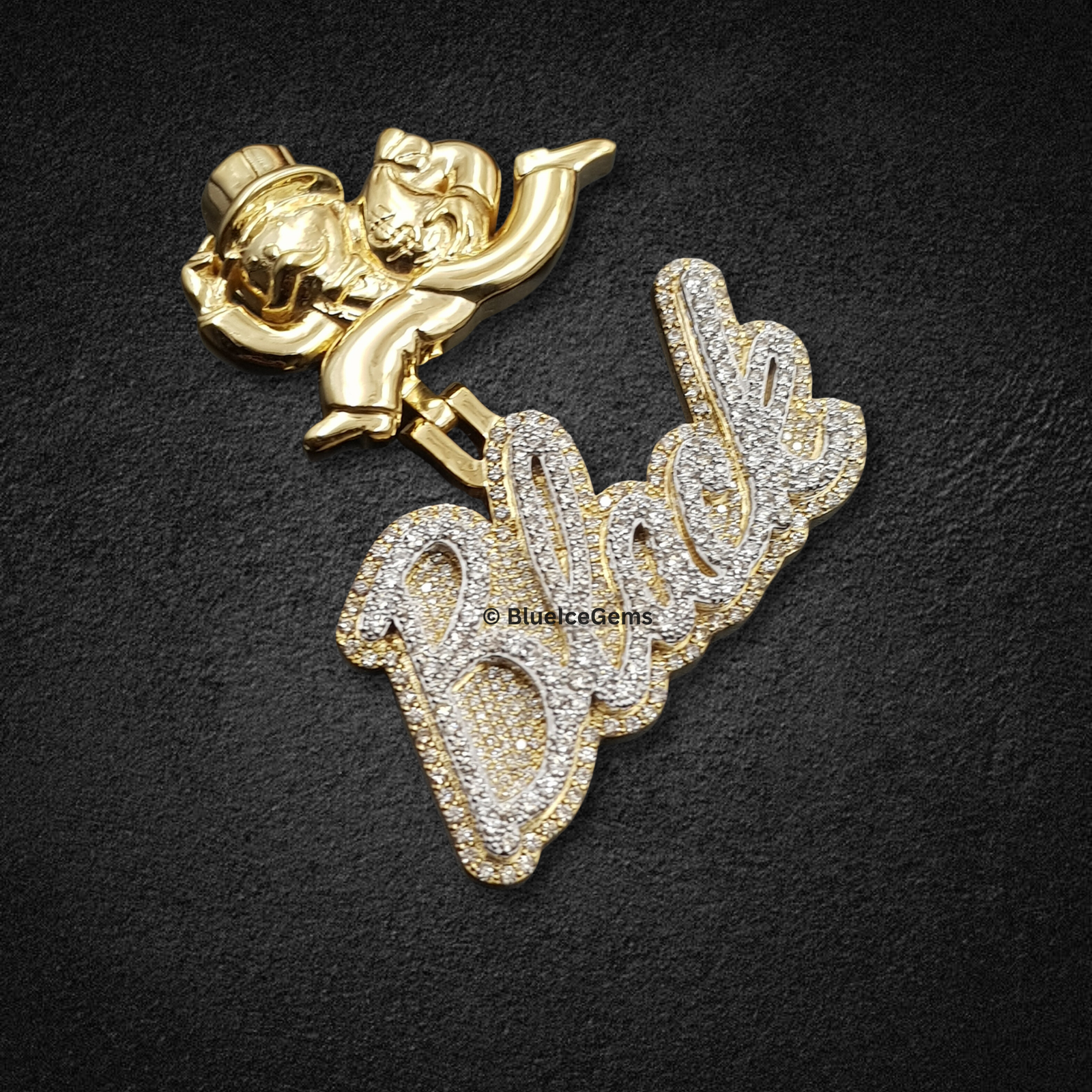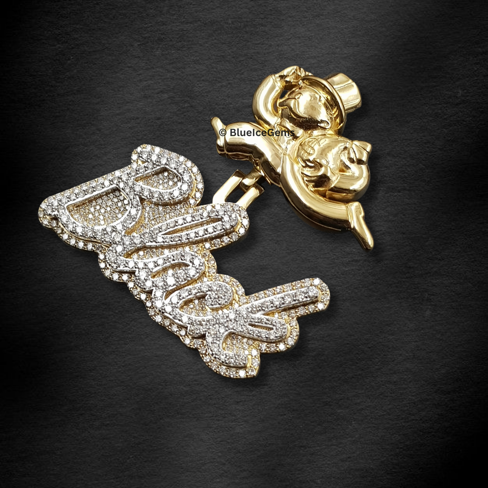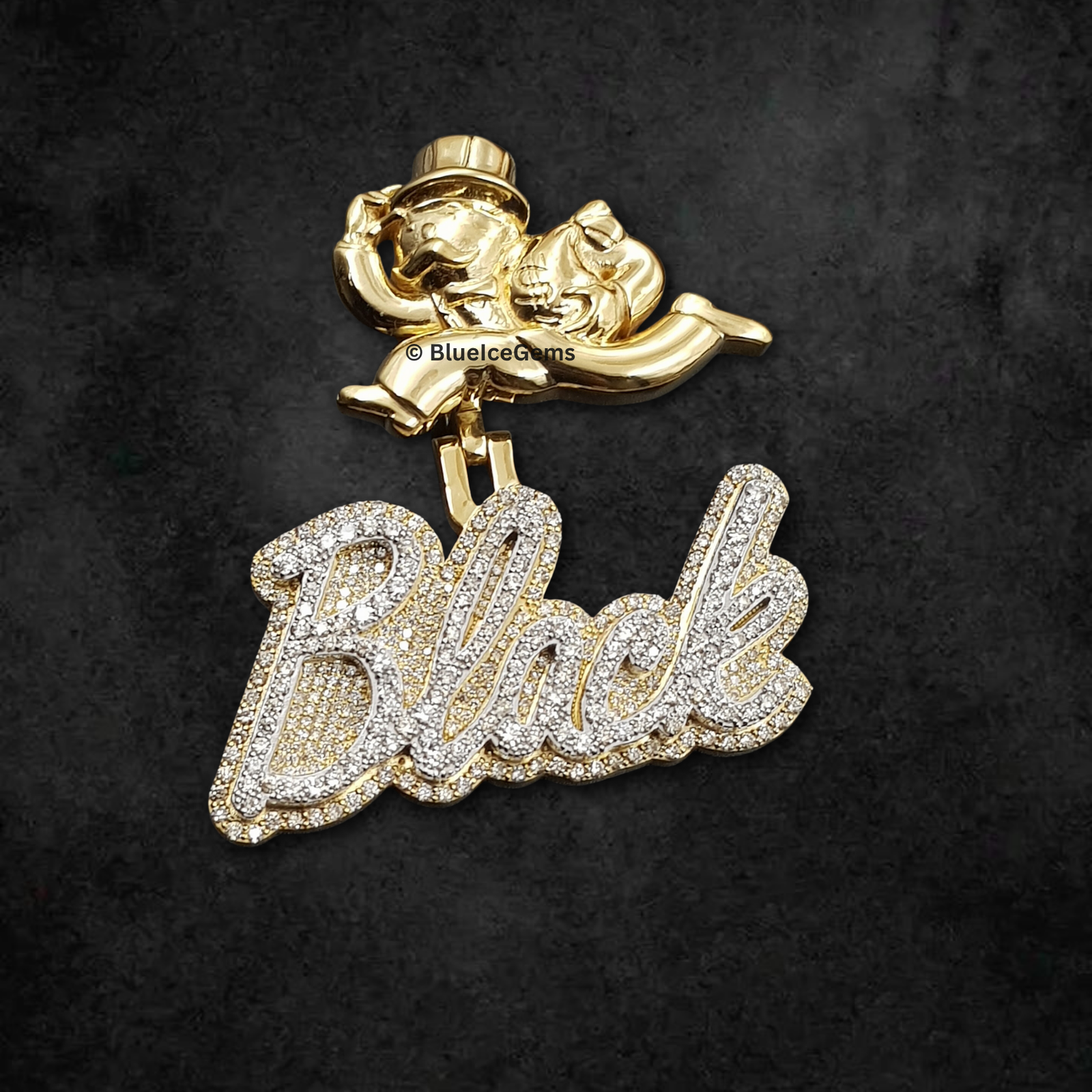 Declare your ambition and showcase your vision of success with this audacious “Black” script pendant, an extraordinary creation exclusively from BlueIceGems. This magnificent piece is lavishly and meticulously pave-set with brilliant white diamonds, ensuring every elegant curve shimmers with an unbroken surface of pure fire and unparalleled scintillation that radiates captivating light. The bold script of “Black” is beautifully framed in warm, rich yellow gold, providing a luxurious contrast that dramatically enhances the diamonds’ icy sparkle and adds to its opulent appeal. To further amplify its profound meaning, this pendant is boldly crowned by a meticulously crafted, highly polished yellow gold figure resembling a rich uncle or banker. This unique and striking detail powerfully symbolizes prosperity, financial acumen, and undeniable success. This isn’t just a piece of fine jewelry; it’s a truly unique and uncompromised statement piece, designed to be a radiant emblem of your drive and accomplishments, exuding luxury and unwavering confidence.