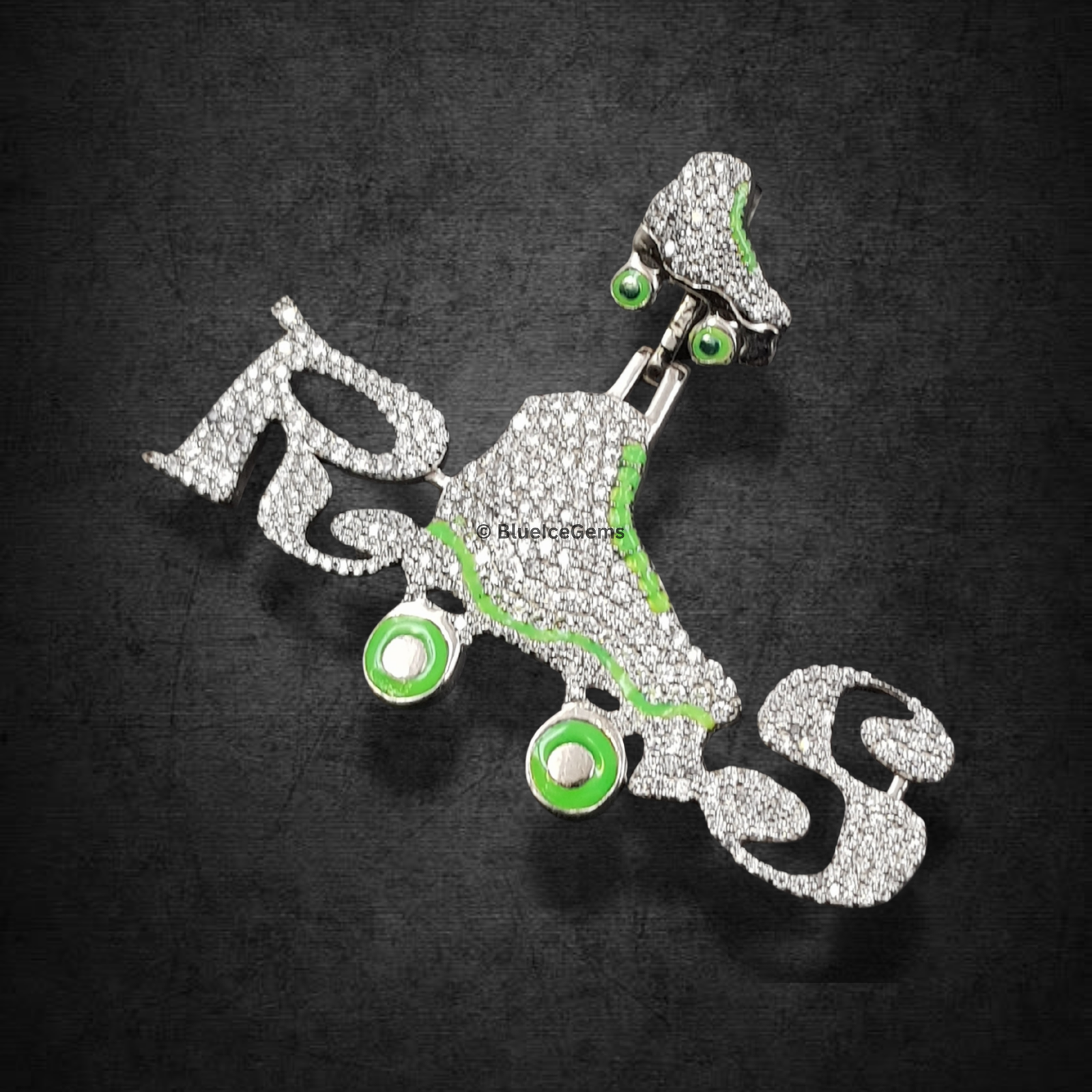 Roll into style and express your unique personality with The “Rollerskate RS” Diamond & Enamel Pendant, a truly dynamic and captivating piece from BlueIceGems. This impressive custom pendant features the initials “R” and “S” in bold, flowing forms, embodying a sense of movement and individuality. Every contour of these striking initials is meticulously pave-set with an astonishing array of brilliant-cut white diamonds, creating an unbroken surface of pure fire and unparalleled scintillation. The sheer density of diamonds ensures it catches and reflects light with breathtaking brilliance from every angle, radiating pure sparkle. This isn’t just a pendant; it’s a powerful and luxurious emblem, designed to be a radiant testament to your unique style and uncompromised flair.