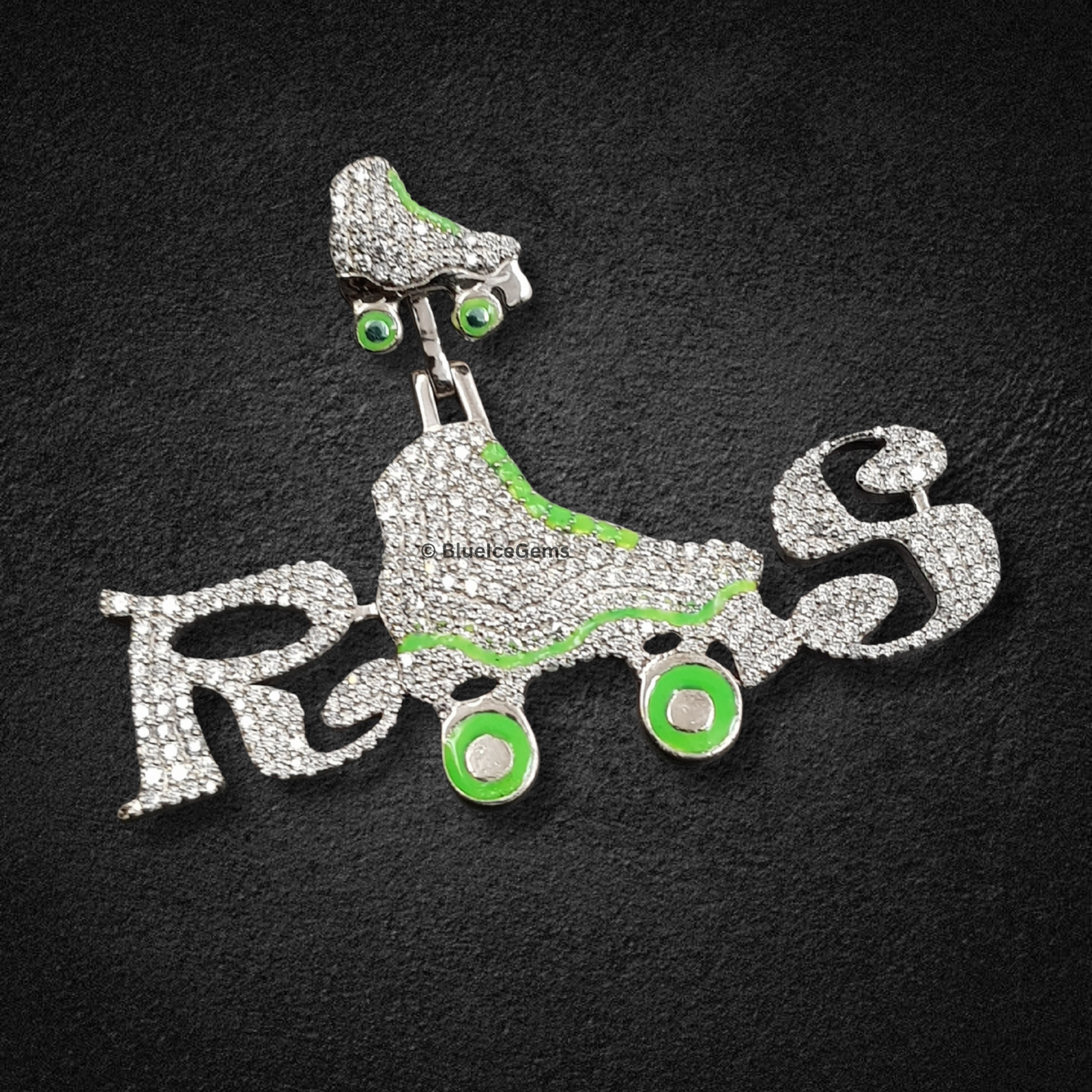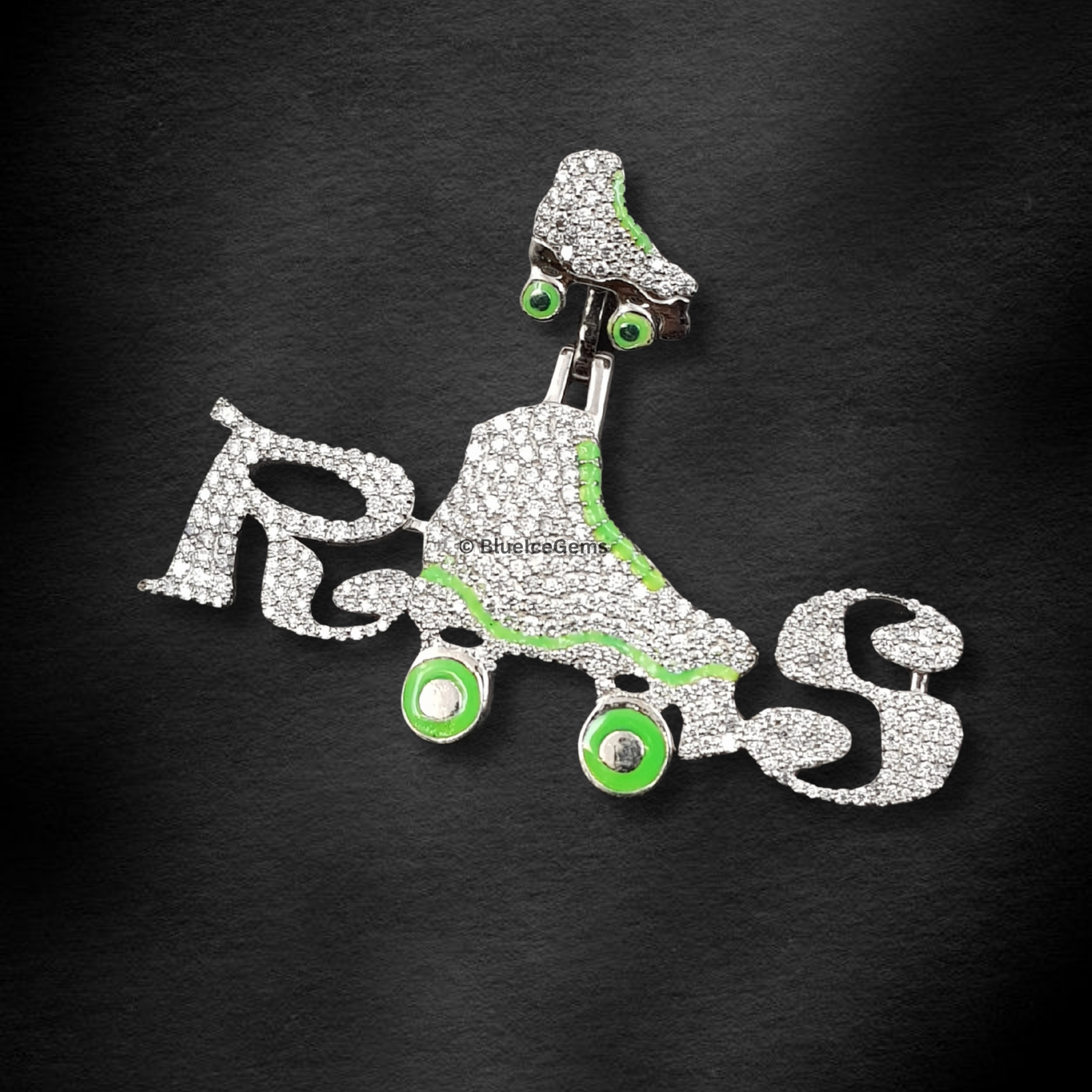 A vibrant and playful “RS” initial pendant, dazzling with pave-set diamonds, featuring a detailed rollerskate with vivid green enamel accents and wheels.