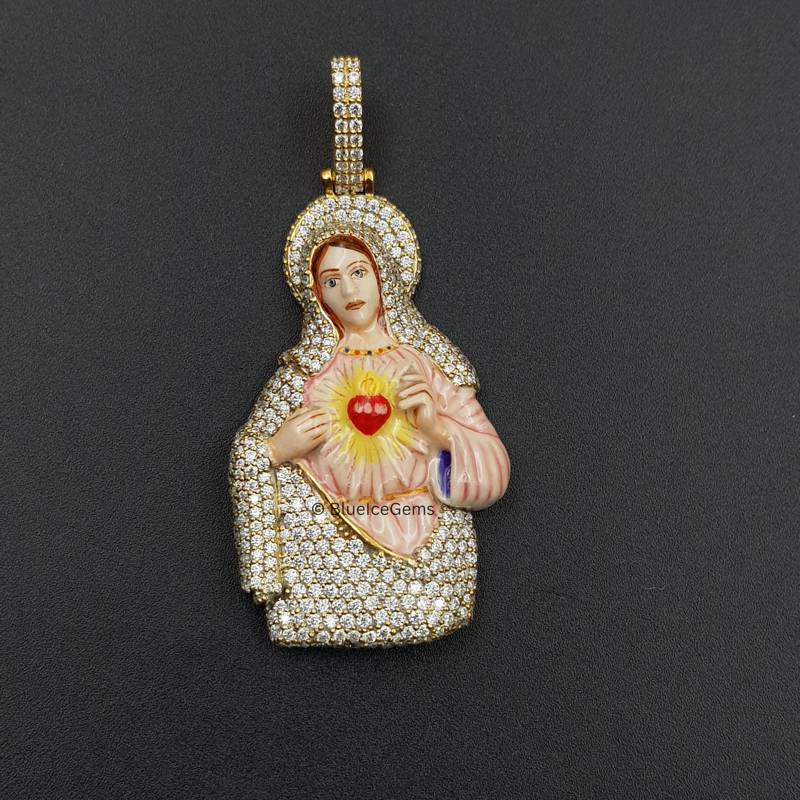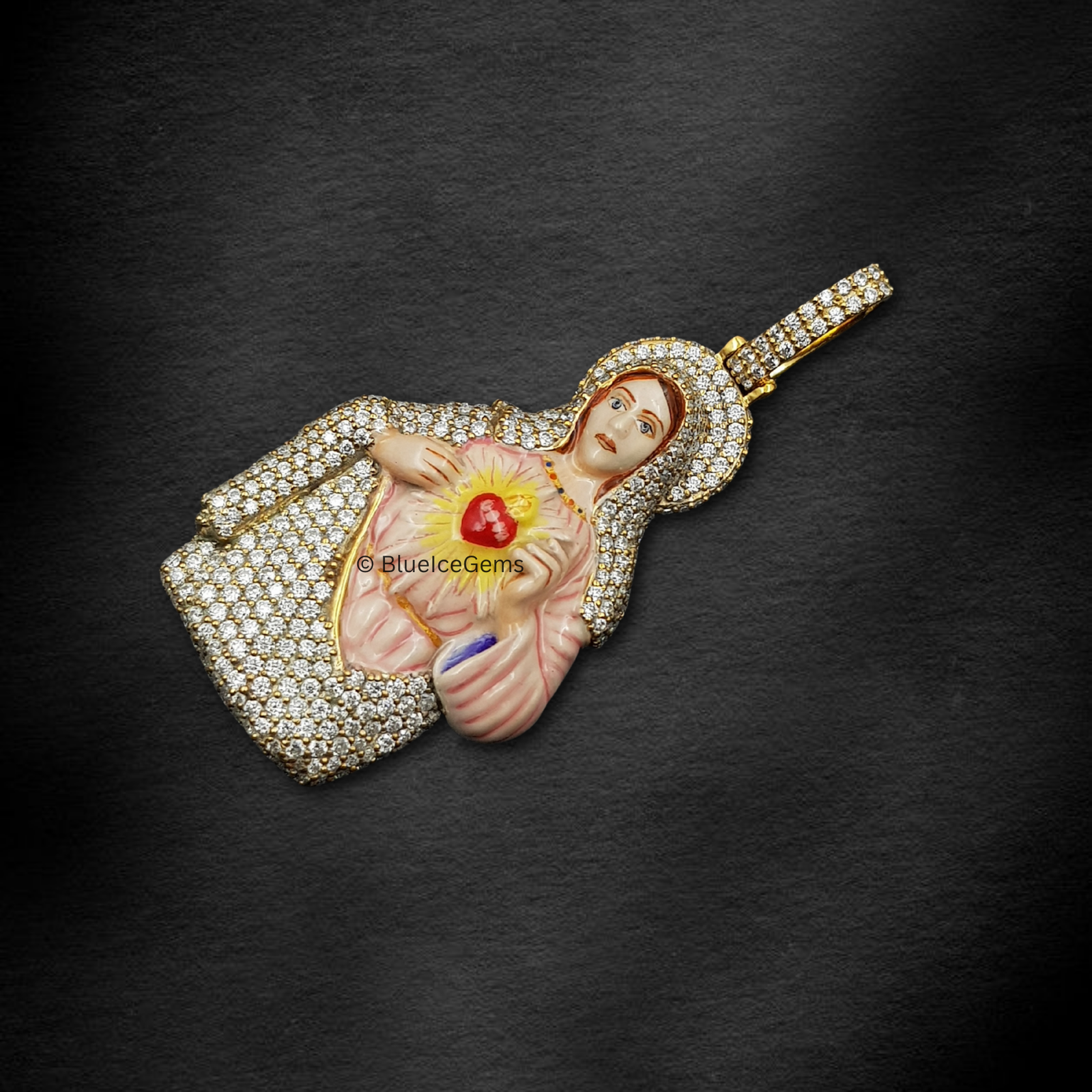 A breathtaking pendant depicting a Madonna figure with a lifelike face, a diamond-paved robe, and a vibrant enamel Sacred Heart, framed in yellow gold.
