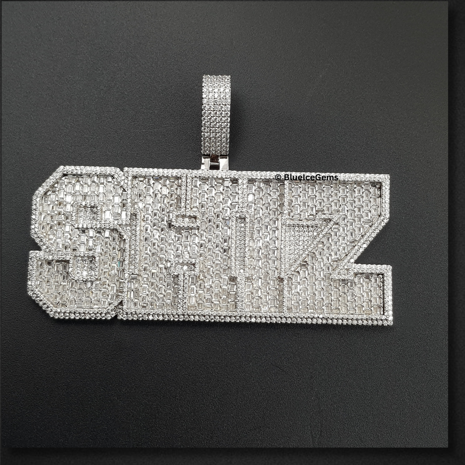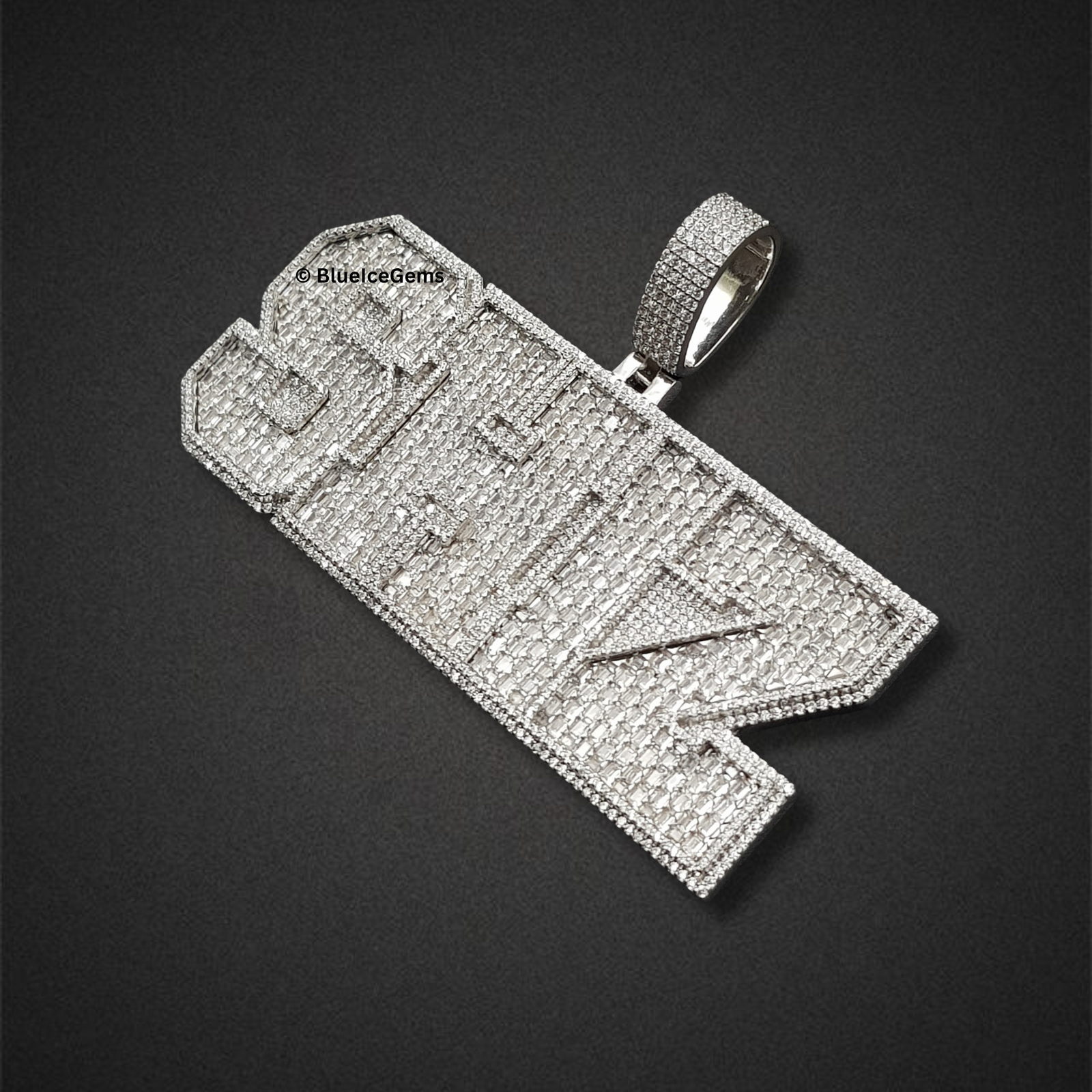 Command attention and make a truly monumental statement with this extraordinary “SHIZ” pendant, an exclusive creation from BlueIceGems. This magnificent piece is meticulously crafted with an astonishing array of crisp baguette-cut diamonds, precisely set to deliver striking linear brilliance and a modern, geometric sparkle. These captivating baguettes are flawlessly complemented by a dazzling pave diamond border, ensuring an uninterrupted surface of pure fire and unparalleled scintillation that radiates captivating light from every angle. Its robust, substantial three-dimensional form is expertly crafted in gleaming, highly polished white gold, offering a sleek, contemporary aesthetic that beautifully enhances the diamonds’ icy brilliance. This piece is more than just jewelry; it proudly exudes uncompromised luxury and an audacious, bold style, making a powerful and unforgettable statement for the discerning individual who demands nothing less than perfection.