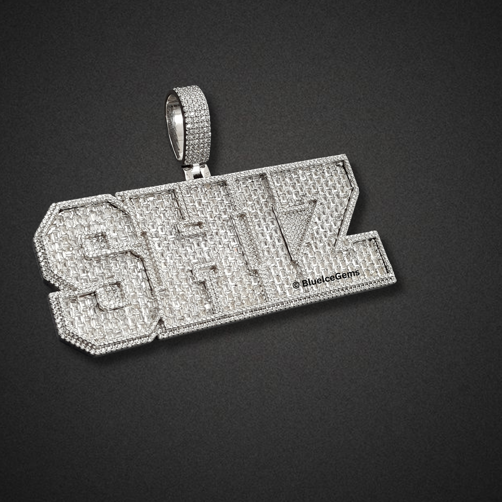 A massive “SHIZ” pendant, fully iced out with both baguette and pave diamonds, set in radiant white gold, for a show-stopping and audacious personal statement piece.