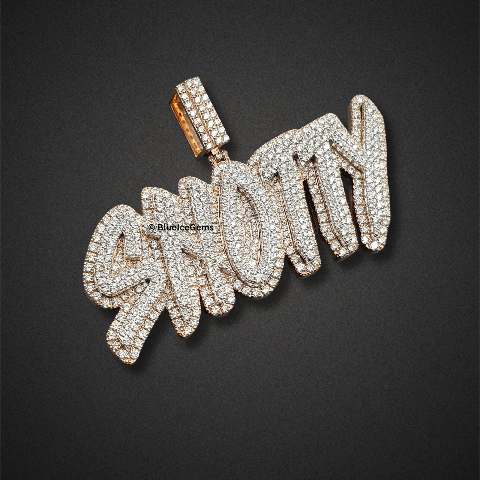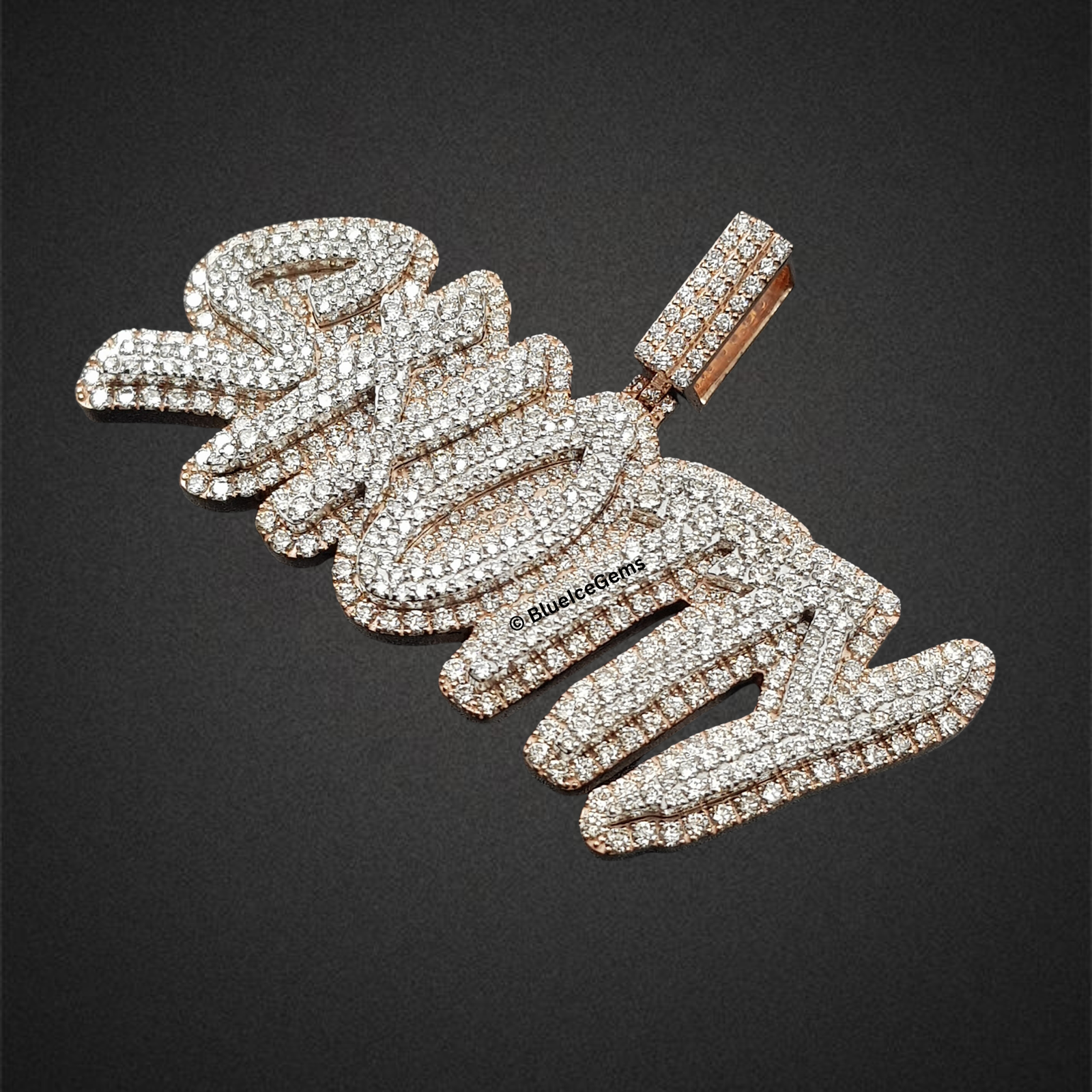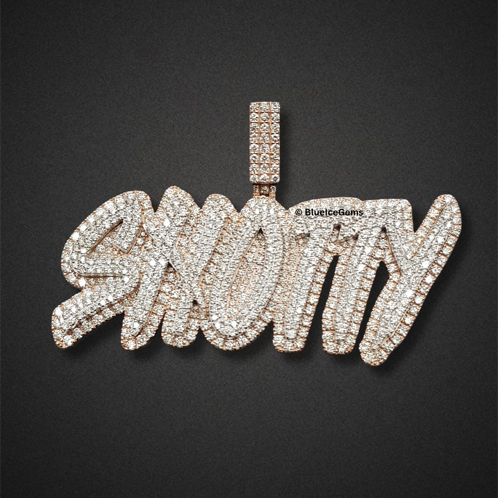 Celebrate a beloved nickname or cherished connection with The “Shorty” Rose Gold & Diamond Script Pendant, a truly enchanting piece that blends personal sentiment with radiant luxury. This impressive custom pendant elegantly spells out “Shorty” in a bold, flowing script font, embodying a unique and affectionate touch. Every delicate contour and flourish of the name is meticulously pave-set with an astonishing array of brilliant-cut white diamonds, creating an unbroken surface of pure fire and unparalleled scintillation. The incredible density of diamonds ensures it catches and reflects light with breathtaking brilliance from every angle, radiating pure sparkle. This radiant display is beautifully complemented by the warm, romantic glow of its rose gold setting, adding an extra layer of sophistication and warmth to this already captivating design.