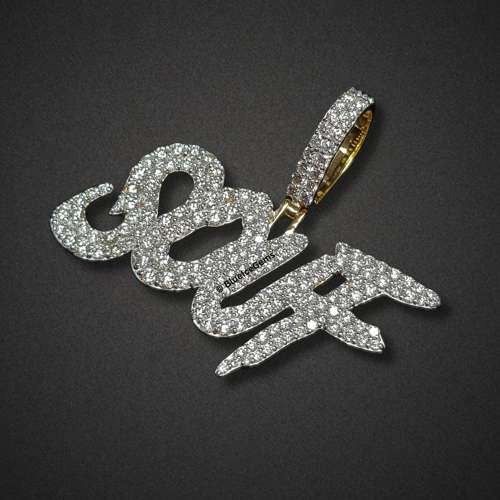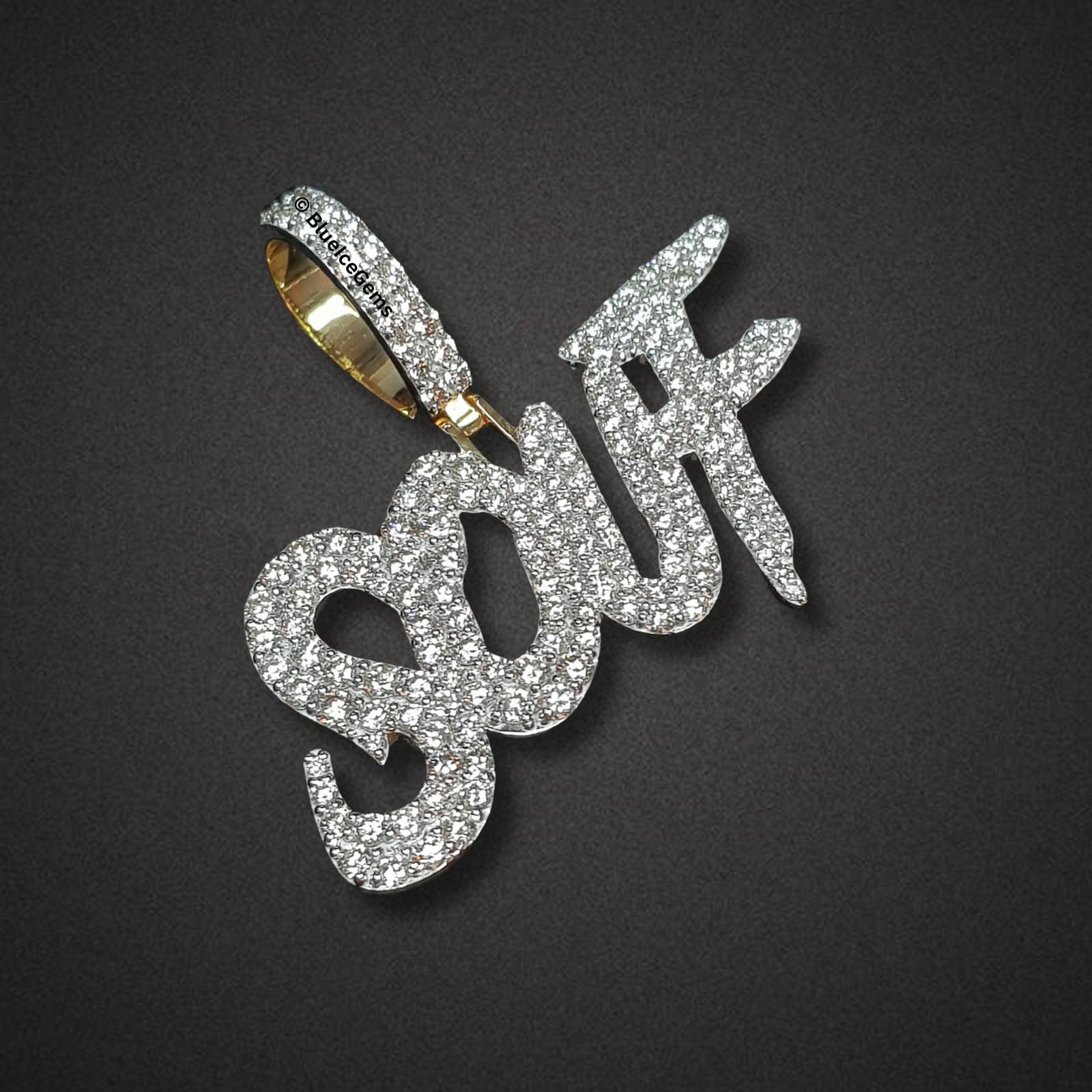 Express your deepest essence with The “SOUF” Diamond Script Pendant, a truly captivating and brilliantly crafted piece designed to resonate with personal meaning. This impressive custom pendant elegantly spells out “SOUF” in a dynamic, flowing script font, with every delicate curve and flourish meticulously pave-set with an astonishing array of brilliant white diamonds. The sheer density of these diamonds creates an uninterrupted surface of pure fire and scintillation, ensuring it catches and reflects light with unparalleled brilliance from every conceivable angle. Crafted primarily in gleaming white gold for the diamond settings, a subtle touch of polished yellow gold is visible at the bail’s base, adding a refined contrast. The integrated, diamond-studded bail ensures a secure and seamless attachment to your favorite chain, allowing this exceptional piece to hang gracefully and beautifully express individuality and inner strength.