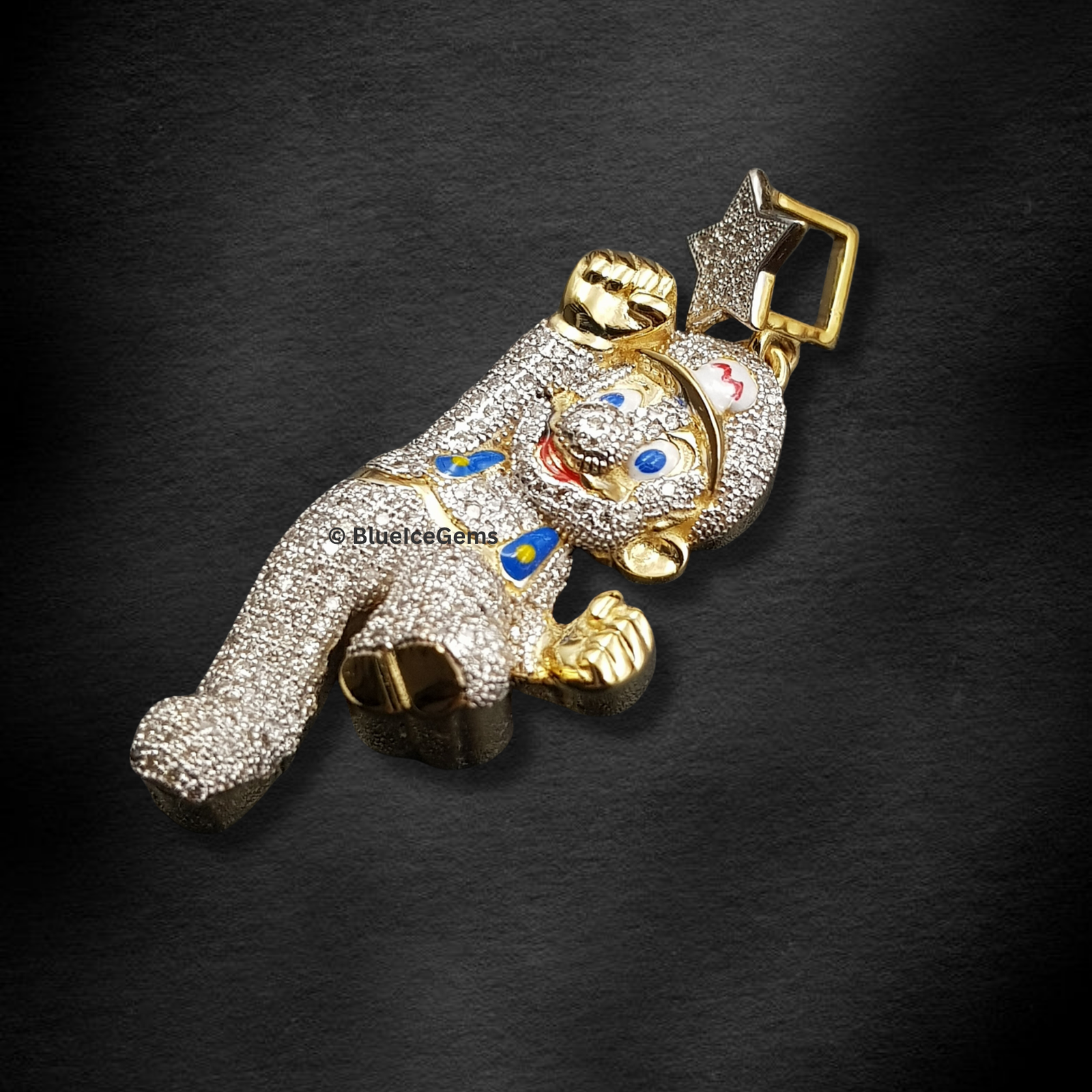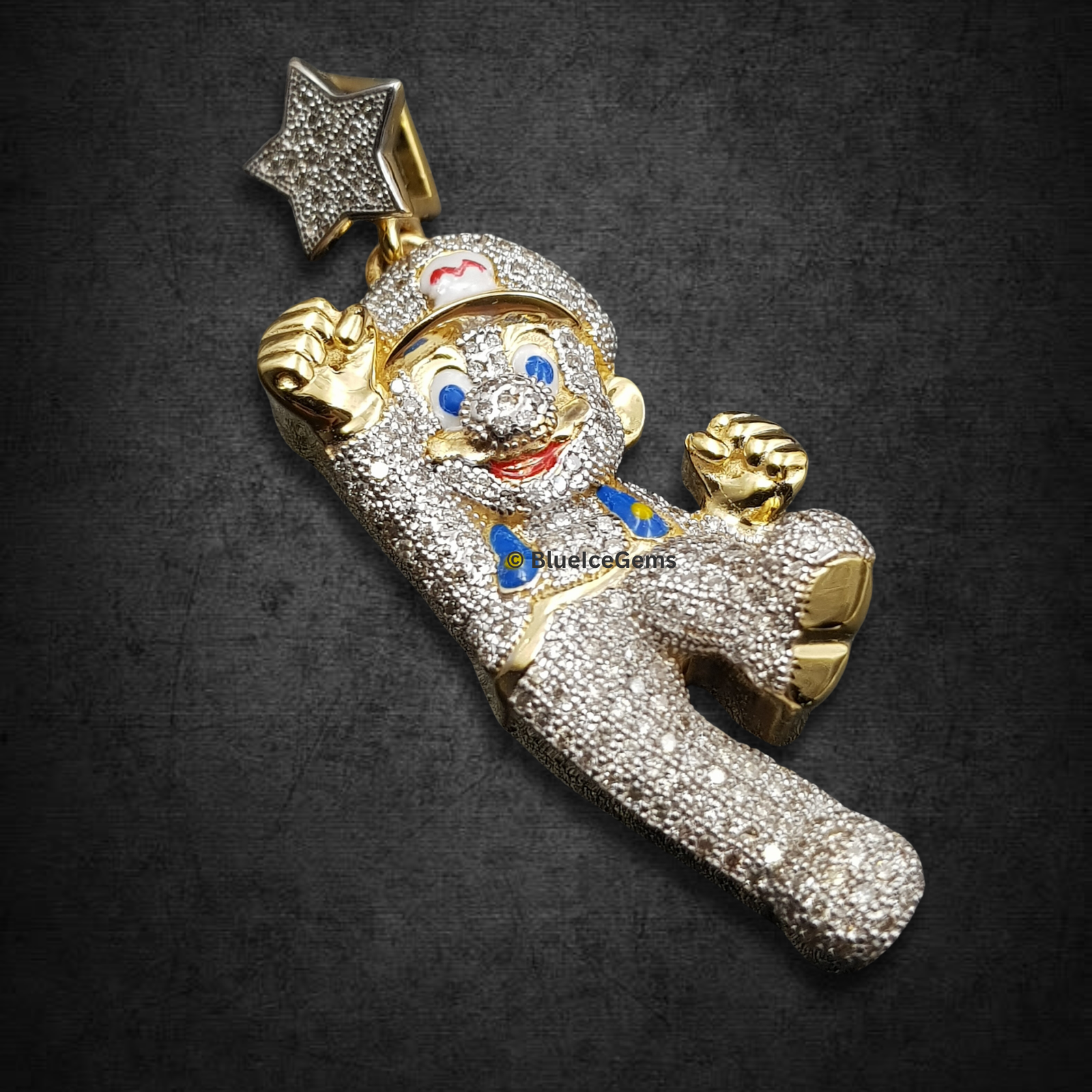 A playful yet luxurious Mario character pendant, lavishly pave-set with brilliant white diamonds, accented with gold, and clutching a sparkling diamond star.