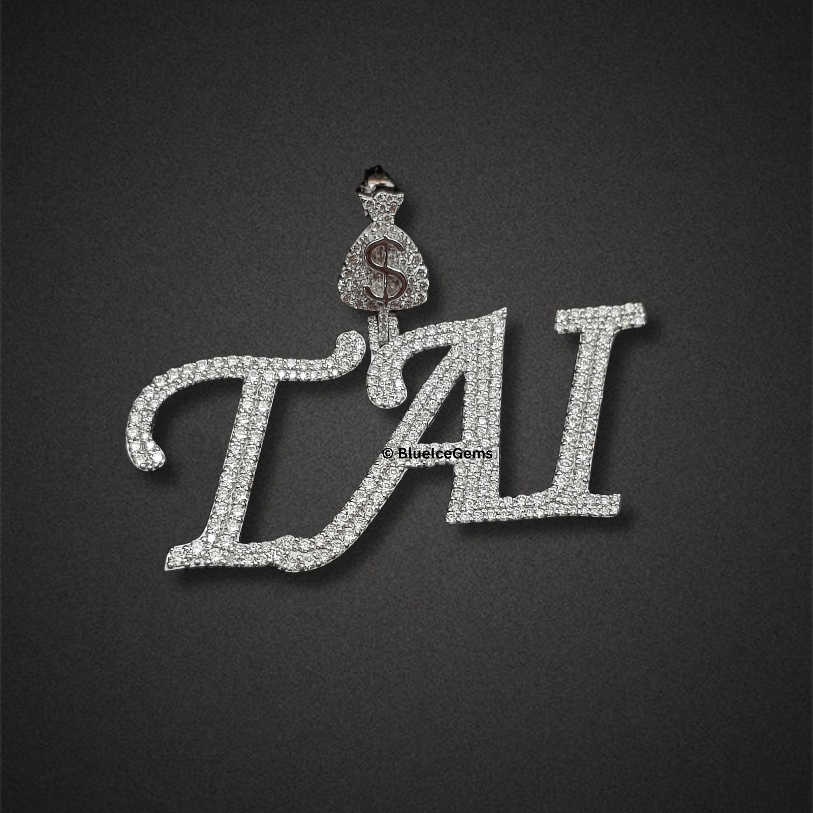 A dazzling “TAI” initial pendant, entirely pave-set with brilliant white diamonds, uniquely crowned with a diamond-studded money bag with a dollar sign.