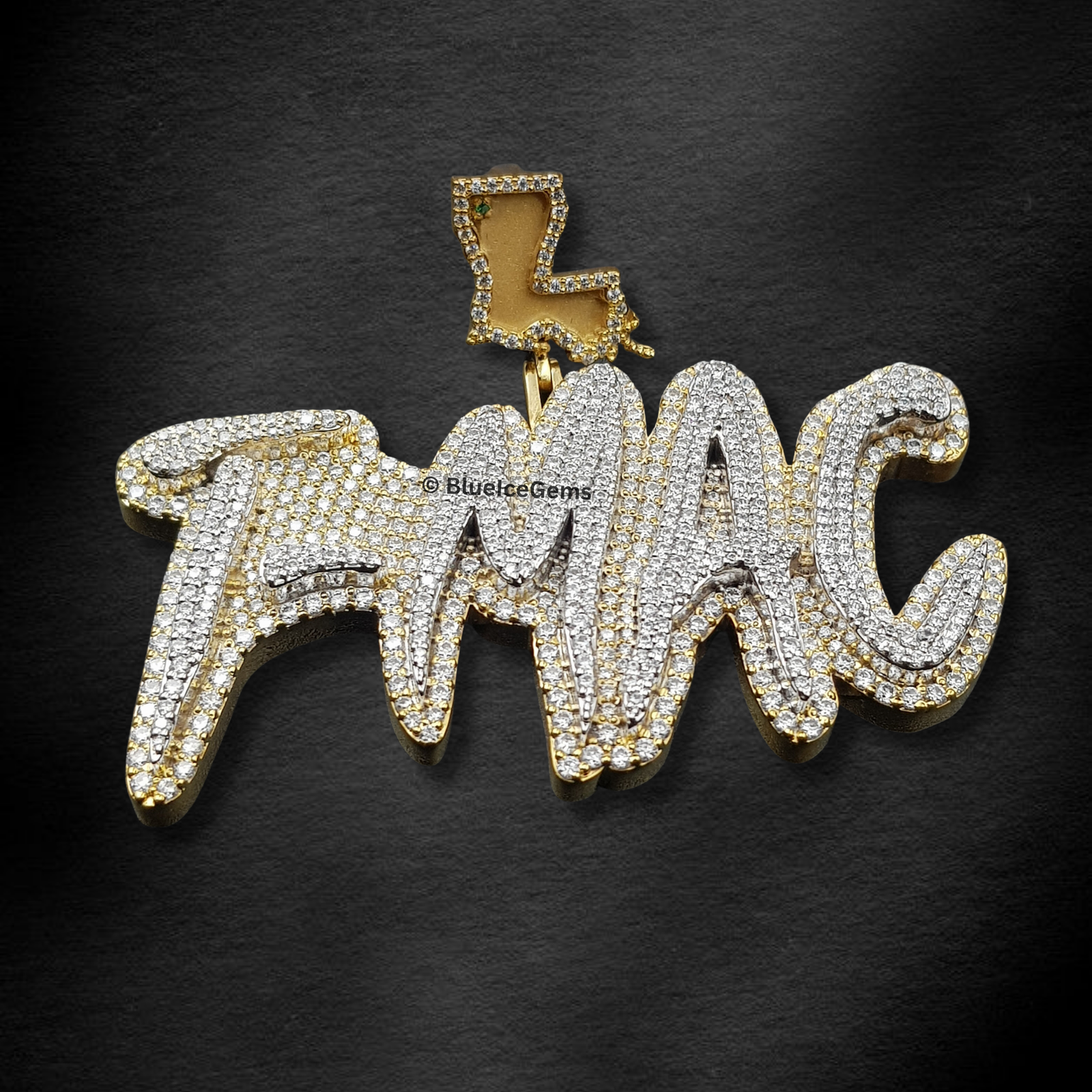 & Free ShippingA dazzling “TMAC” pendant, fully iced out with sparkling diamonds, featuring a unique dripping design, framed in yellow gold, topped with a Louisiana outline, for a bold and luxurious statement.