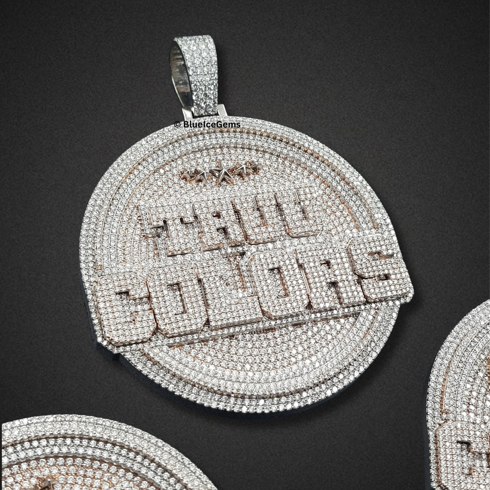 This monumental circular medallion (single 3d pendent)from BlueIceGems is an absolute cascade of light, meticulously designed to radiate brilliance and profound authenticity. It is entirely and artfully blanketed in brilliant pave diamonds, each gem precisely set to create an unbroken, shimmering surface of pure fire and unparalleled scintillation that captures every eye. At the very heart of this dazzling piece, the bold words “TRUE COLORS” are prominently featured, rendered in the same captivating diamonds, conveying a powerful message of authenticity and self-expression. A subtle yet meaningful star emblem gracefully crowns the design, adding a touch of celestial elegance and aspiration. All these elements are beautifully framed in radiant rose gold, providing a warm, luxurious contrast that enhances the diamonds’ icy sparkle and deepens the medallion’s opulent appeal. This isn’t just a piece of fine jewelry; it’s a powerful and authentic statement of personal luxury, designed for those who wear their true self with uncompromised brilliance.
