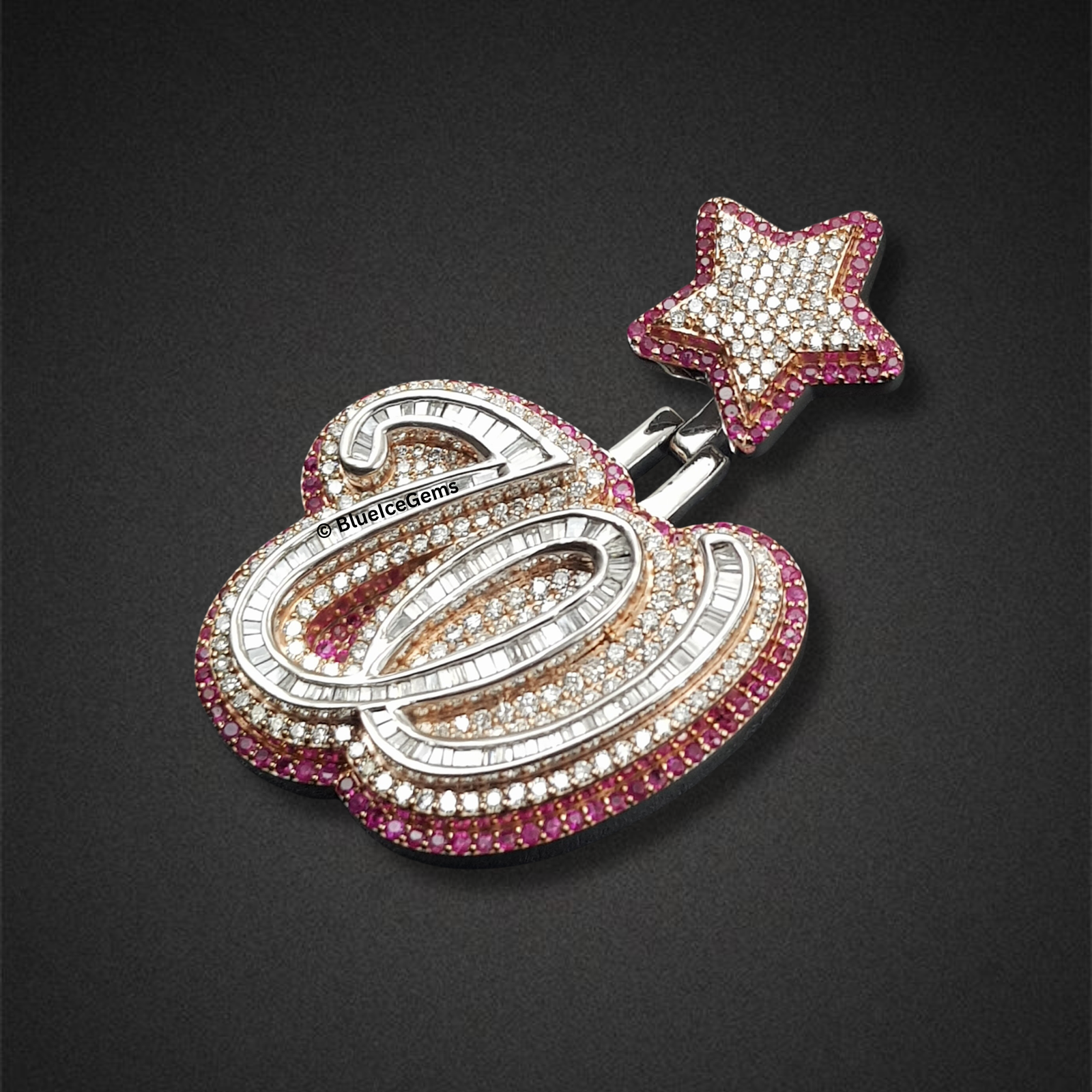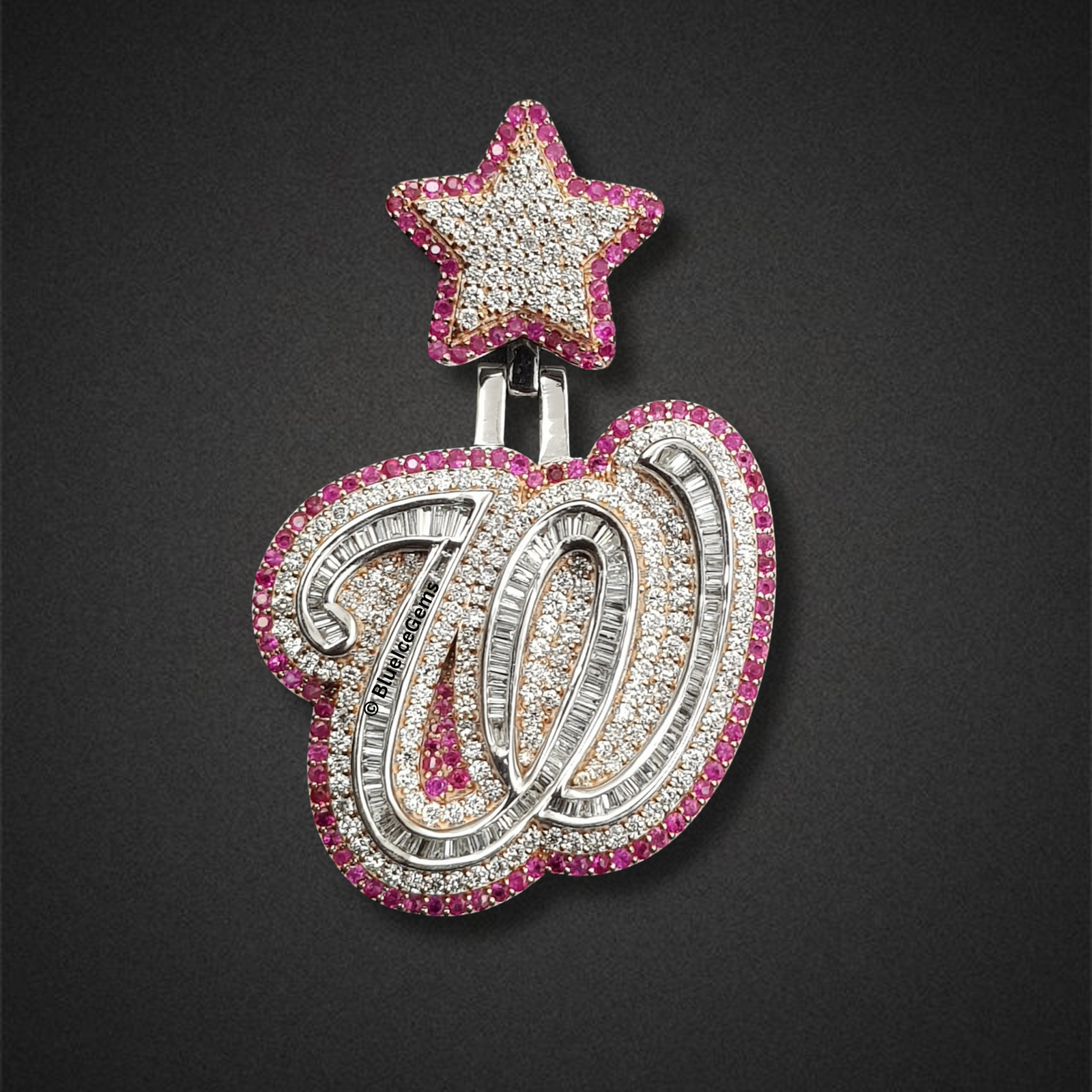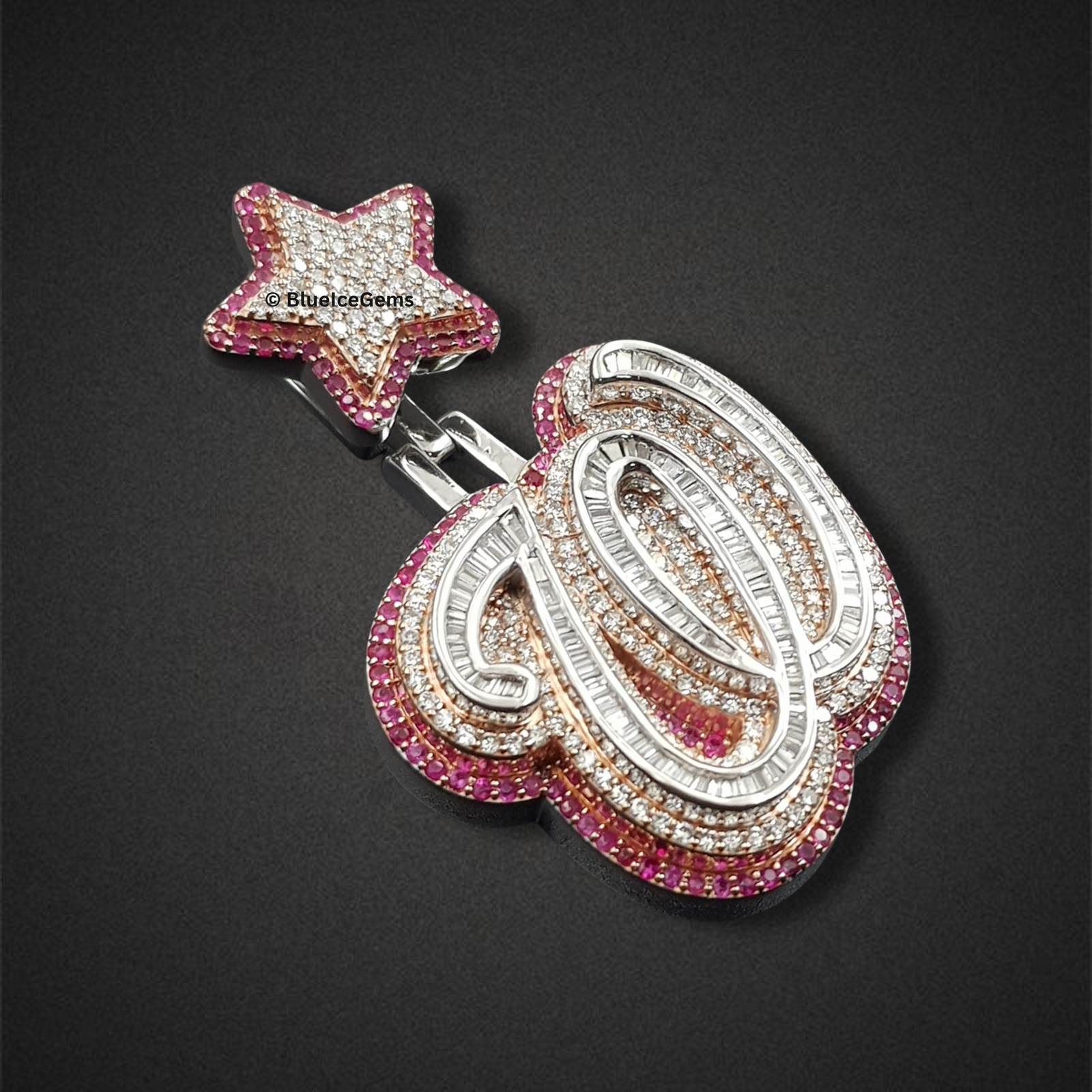 Command attention and make a truly monumental statement with this extraordinary “W” initial pendant, an exclusive creation from BlueIceGems. This magnificent piece showcases an astonishing and sophisticated blend of precisely cut baguette and pave white diamonds, ensuring a striking linear brilliance complemented by a continuous surface of pure fire. The entire robust, three-dimensional form of the initial is elegantly framed by a vibrant array of pink diamonds, providing a magnificent contrast that dramatically enhances the white diamonds’ icy sparkle and adds a touch of unparalleled opulence. To further amplify its profound symbolism, a dazzling pink and white diamond star sits triumphantly atop, unequivocally symbolizing ambition, achievement, and unparalleled luxury. This isn’t just a piece of fine jewelry; it’s a truly commanding statement, embodying your aspirations, success, and unyielding presence with breathtaking brilliance.