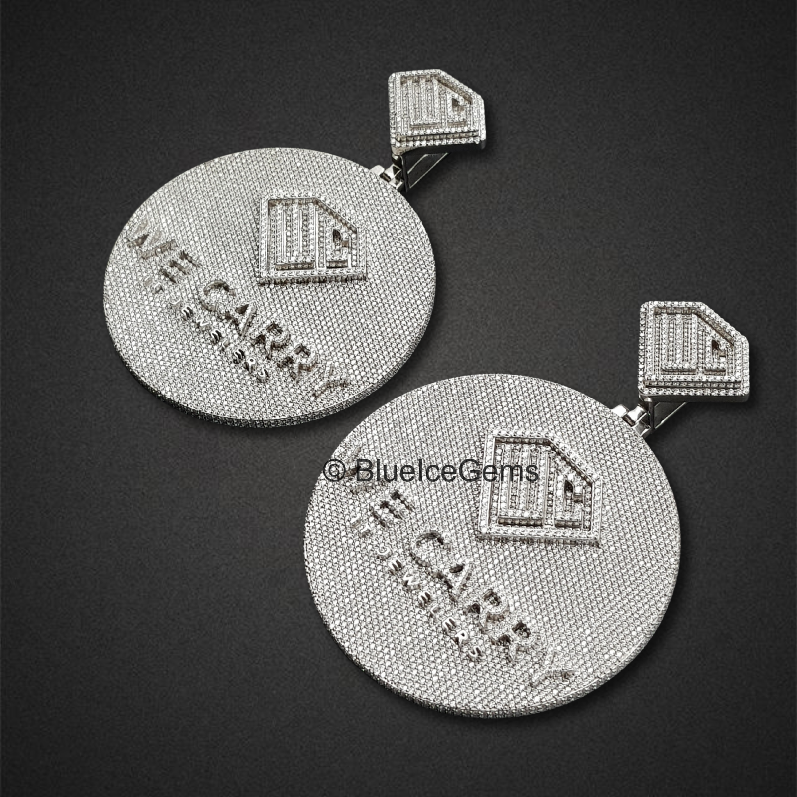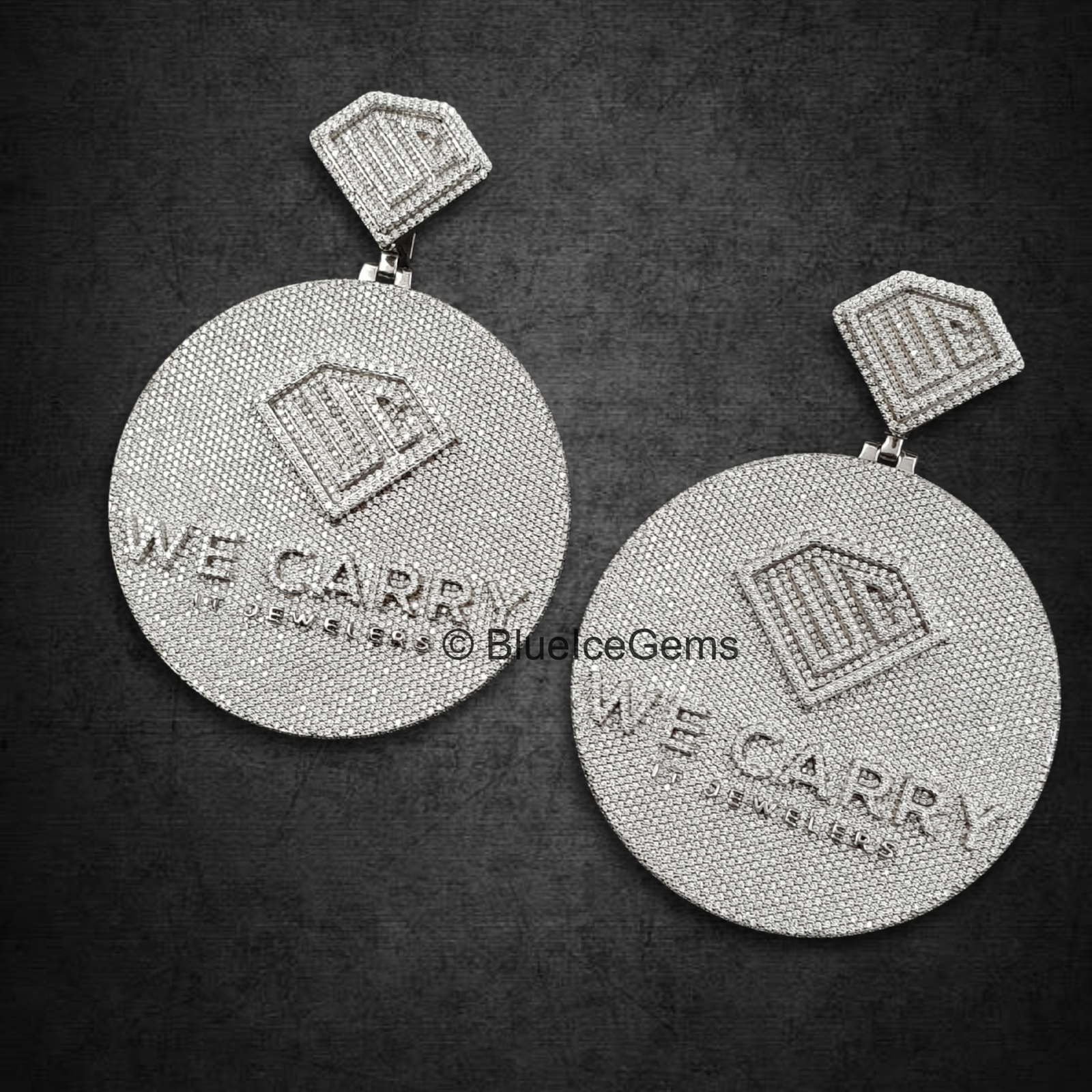 A magnificent pair of circular medallions, entirely pave-set with dazzling white diamonds, featuring a diamond emblem and the bold inscription “WE CARRY JEWELS,” topped with a diamond-studded diamond shape bail.