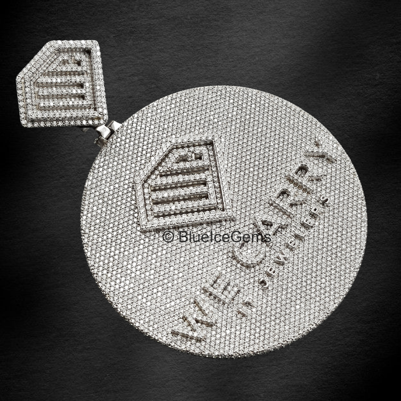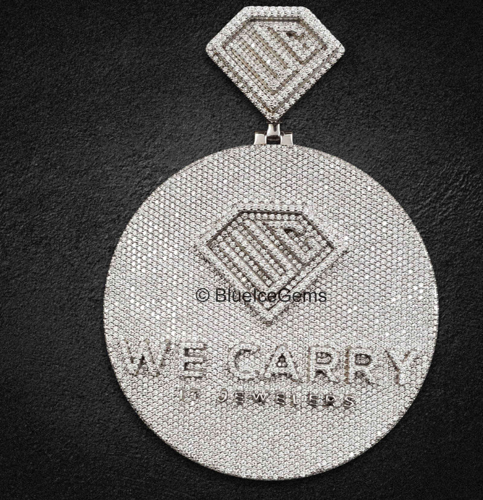Make an undeniable statement of your brand and unwavering commitment to excellence with The “We Carry Jewels” Diamond Emblem Medallion Pair, an exclusive offering from BlueIceGems. These truly monumental circular pendants are an absolute cascade of light, meticulously blanketed from edge to edge in an astonishing array of pave-set brilliant-cut white diamonds, creating an uninterrupted field of dazzling sparkle. Each individual medallion prominently features a detailed, diamond-encrusted emblem (such as a stylized “JB” or another custom logo) at its very center. This bespoke emblem is also fully iced out, ensuring every detail radiates with exceptional fire and brilliance. Every diamond on these medallions is expertly positioned to maximize its scintillation, capturing and reflecting light from every angle.
