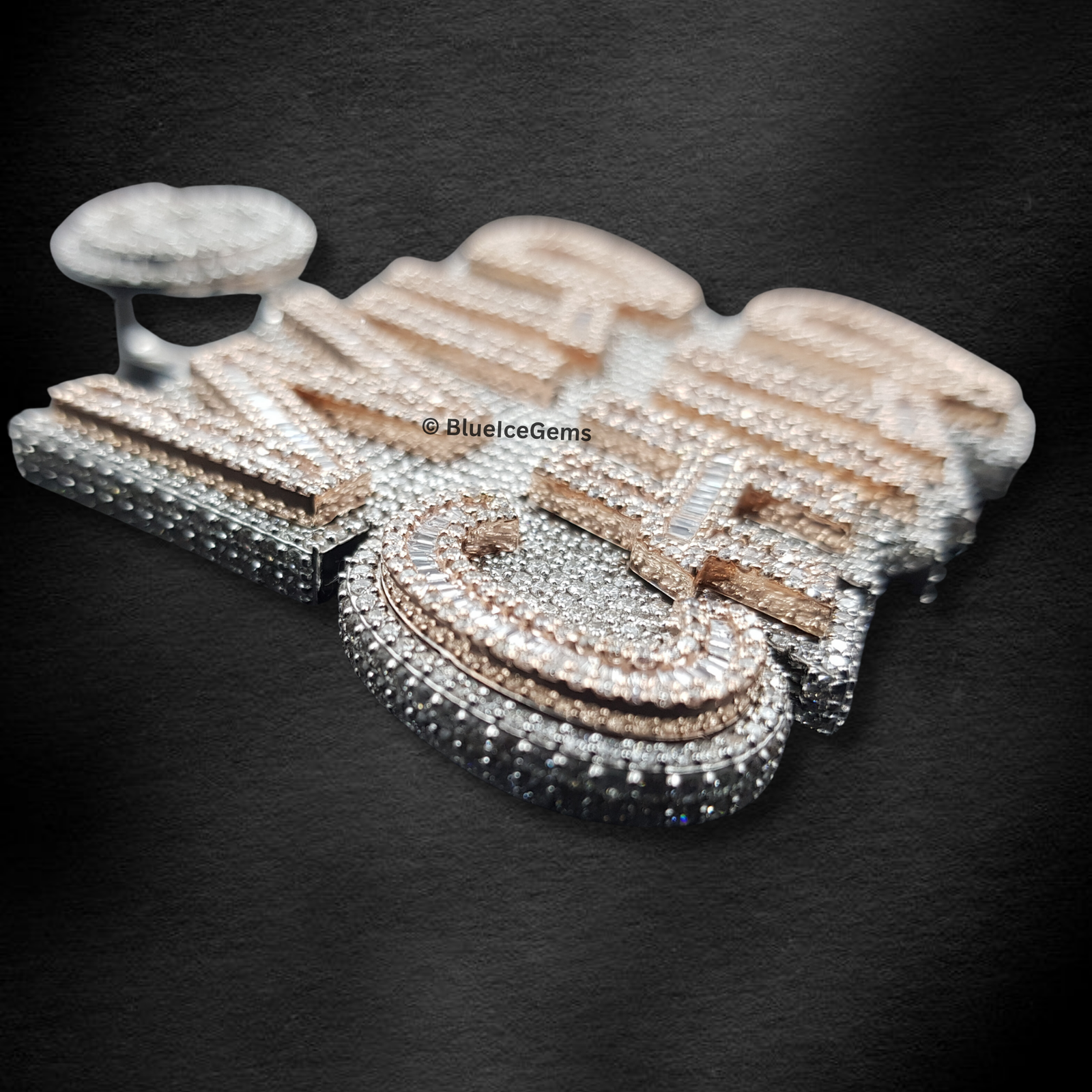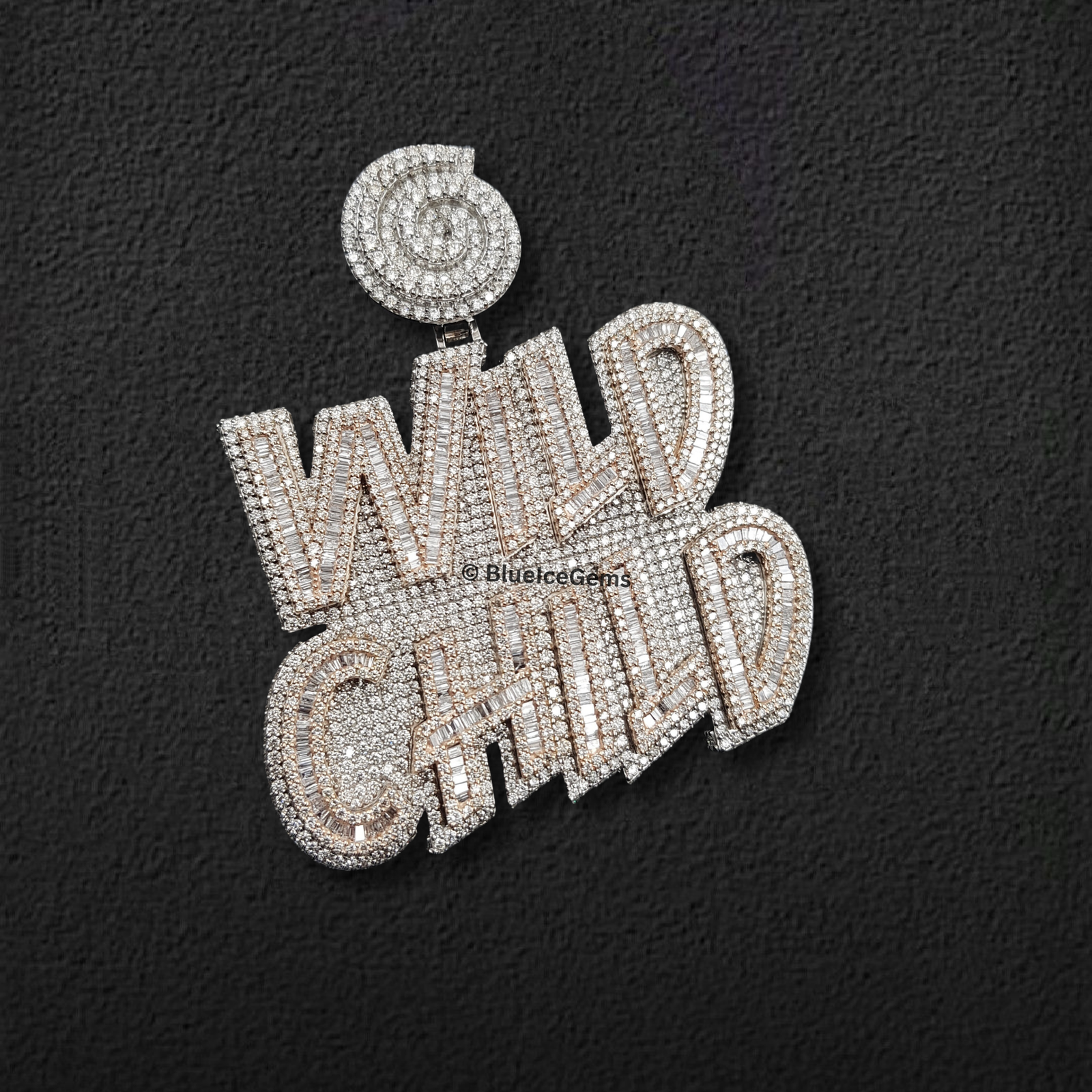 Unleash your untamed, free spirit and make an unforgettable statement with this truly monumental “WILD CHILD” pendant, an extraordinary creation exclusively from BlueIceGems. This magnificent piece is meticulously adorned with a dazzling, sophisticated mix of precisely cut baguette and pave white diamonds, ensuring an unparalleled cascade of pure fire and continuous scintillation that radiates captivating light from every angle. The bold, dynamic lettering of “WILD CHILD” is elegantly outlined in warm, luxurious rose gold, providing a rich, romantic contrast that dramatically enhances the diamonds’ icy sparkle and adds to its opulent appeal. Uniquely crowning this brilliant design is a captivating, intricately detailed diamond-paved swirling vortex bail, a powerful symbol of untamed energy, infinite possibilities, and continuous motion. This isn’t just a piece of fine jewelry; it exudes unparalleled luxury and bold individuality, making a profound and audacious statement for those who dare to live authentically.