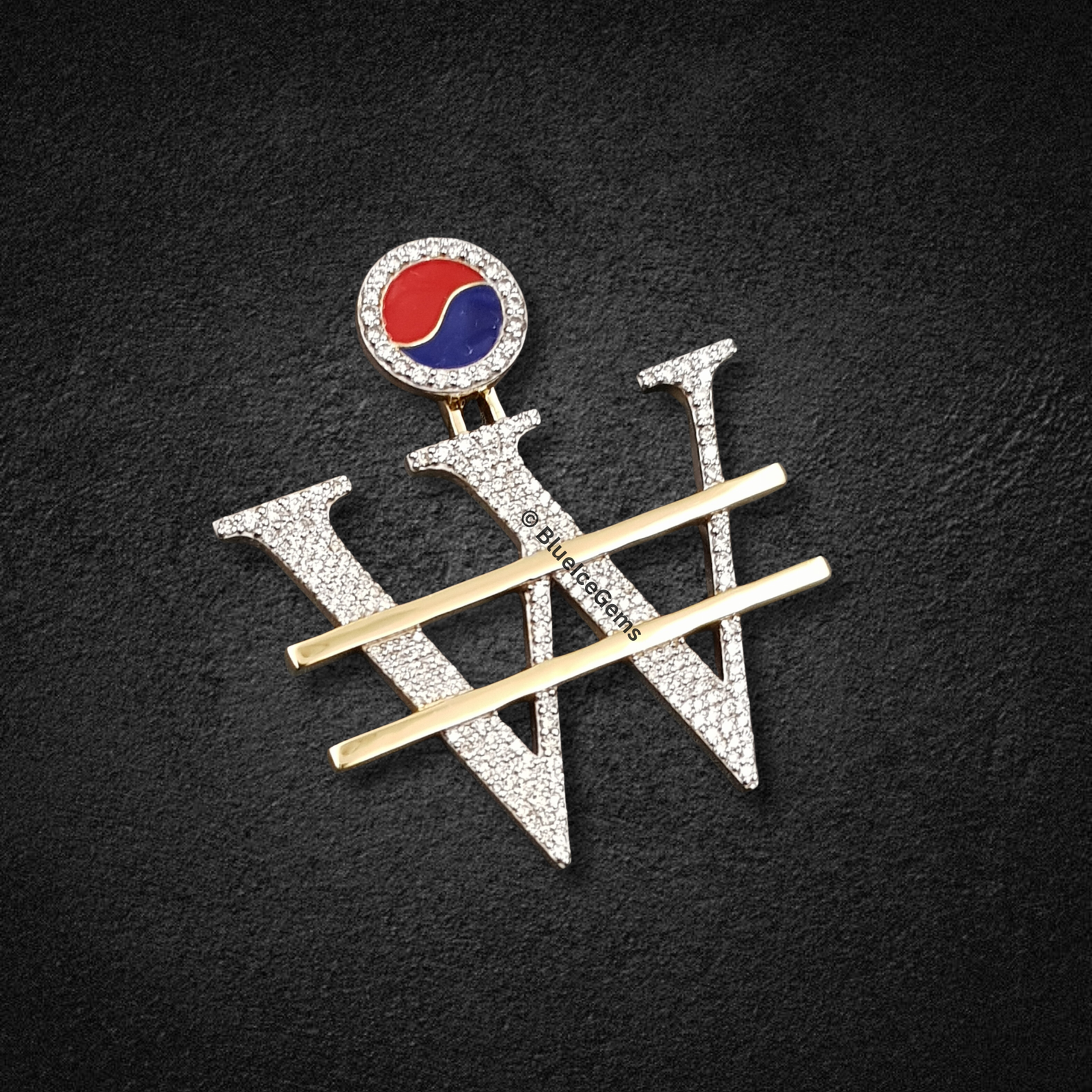 Declare your wealth and celebrate your cultural connection with this captivating Korean Won symbol pendant, an extraordinary creation exclusively from BlueIceGems. This magnificent piece is entirely and meticulously pave-set with dazzling, brilliant white diamonds, ensuring an unbroken, shimmering surface of pure fire and unparalleled scintillation that radiates captivating light from every angle. The iconic Korean Won symbol is further enhanced by elegant horizontal gold bars that precisely intersect its form, adding a sophisticated contrast and reinforcing its luxurious appeal. To beautifully complete this powerful design, the pendant is uniquely crowned by a vibrant red and blue enamel circle, symbolizing national pride and adding a distinctive touch of color. This isn’t just a piece of fine jewelry; it makes a powerful statement of prosperity, cultural pride, and undeniable personal style, perfect for those who appreciate both exceptional craftsmanship and deep personal meaning.