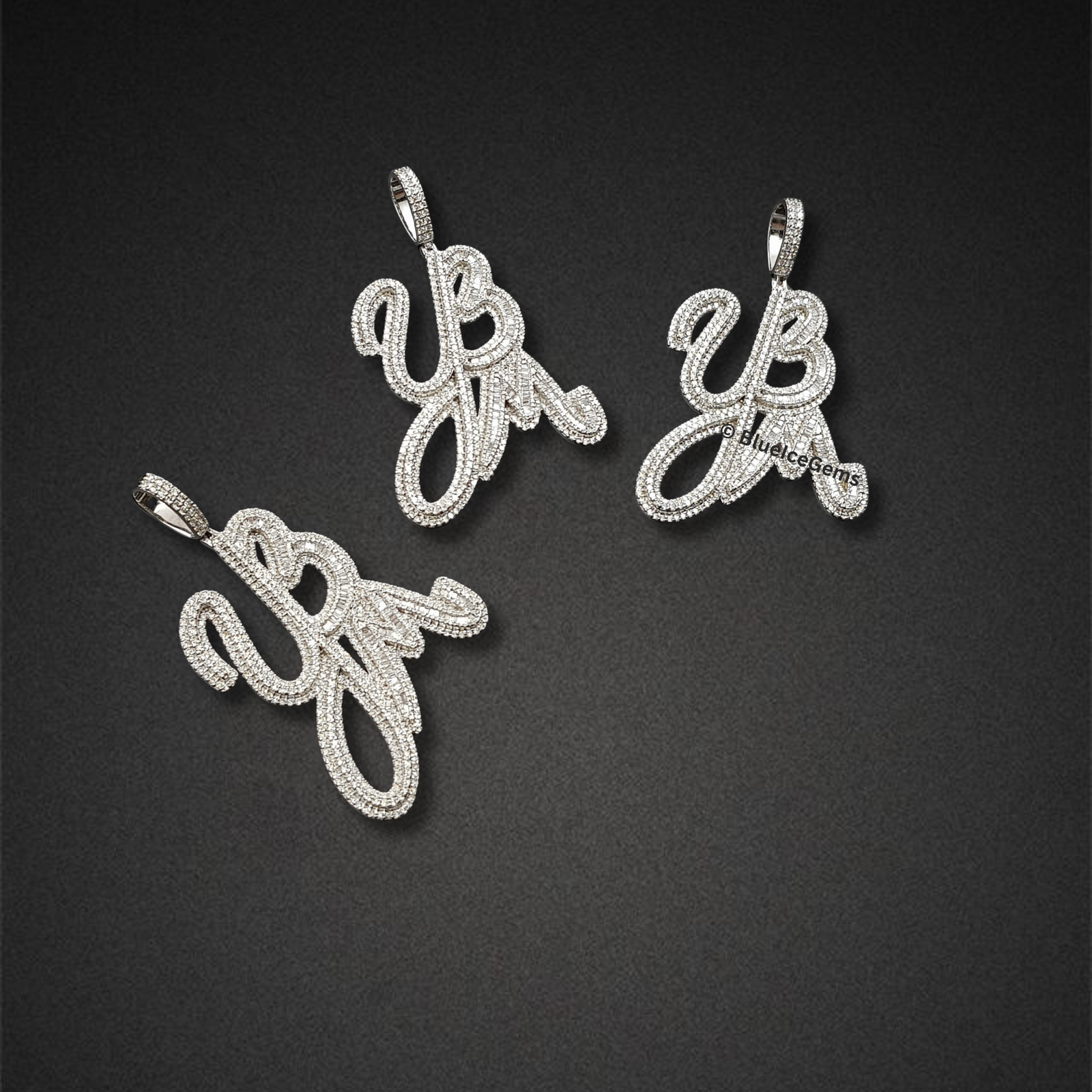 A trio of dazzling “YB” initial pendants, exquisitely crafted in flowing script and entirely pave-set with brilliant white diamonds, perfect for a personalized statement.