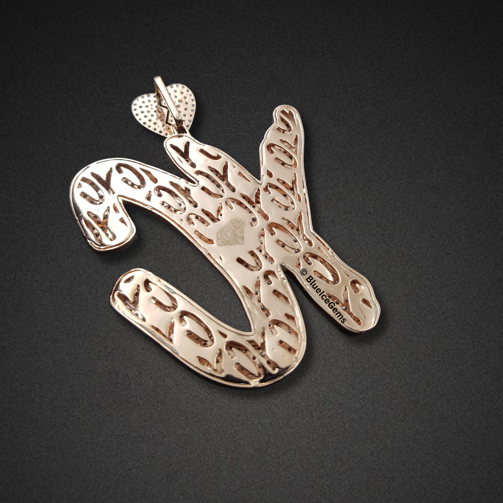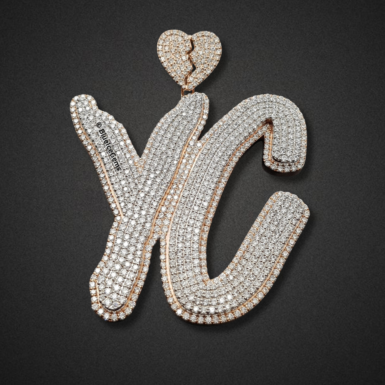 Make a bold and emotional statement with The “YC” Broken Heart Diamond Pendant, a truly captivating piece that masterfully blends personalized initials with powerful symbolism. This impressive custom pendant features the bold initials “YC” in a dynamic, flowing script, with every contour meticulously pave-set with an astonishing array of brilliant white diamonds. The sheer density of these diamonds creates an unbroken surface of pure fire and scintillation, ensuring it captures and reflects light with unparalleled brilliance from every angle. The letters are strikingly outlined and backed by warm rose gold, providing a rich, luxurious contrast. Crowned by a meticulously pave-set diamond broken heart bail, this piece subtly conveys resilience or a poignant connection. Crafted with precision, this pendant is a powerful emblem of identity, emotion, and uncompromised luxury, designed for those who appreciate unique artistry and enduring sparkle.
