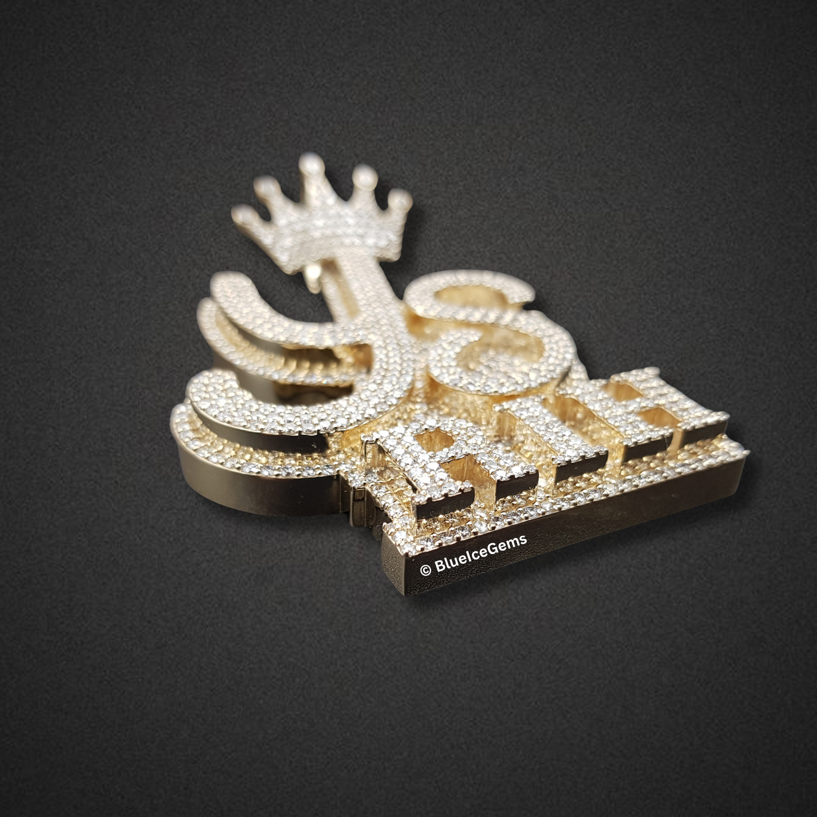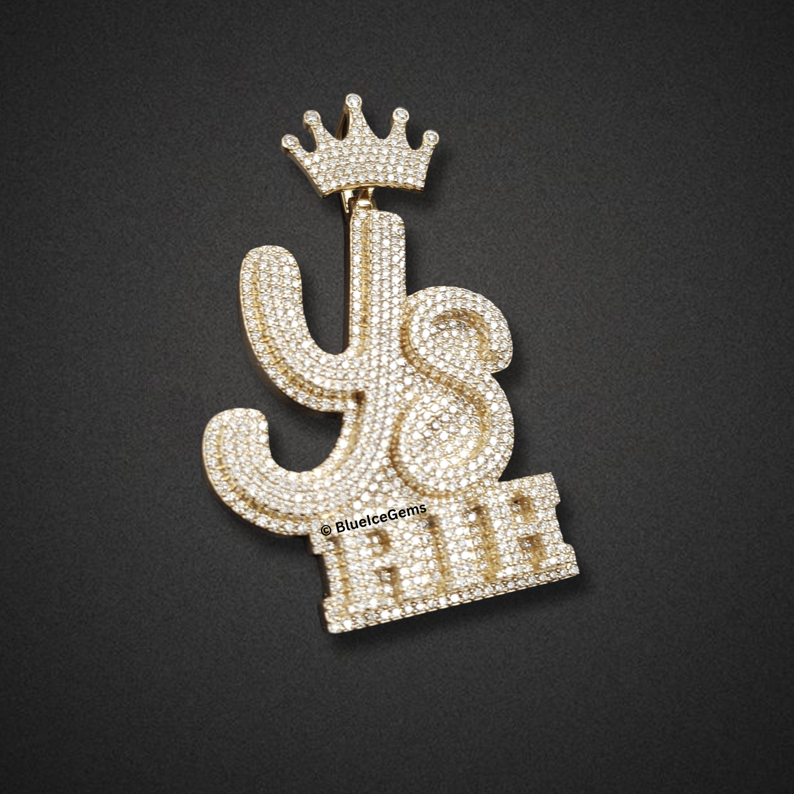 Declare your royal presence and audacious style with The “YS RIH” Crowned Diamond Pendant, a truly magnificent and unapologetically brilliant piece designed to capture all attention. This impressive custom pendant features the bold initials “YS” in a dynamic, three-dimensional script, meticulously crafted and lavishly adorned with an astonishing array of brilliant pave-set diamonds. Each diamond contributes to an uninterrupted surface of pure fire and scintillation, ensuring unparalleled brilliance that catches and reflects light from every conceivable angle. Below, the word “RIH” is displayed in diamond-paved block letters, adding to its commanding presence. The robust form is elegantly outlined and backed by gleaming yellow gold, providing a rich, warm contrast, while a diamond-studded royal diadem crowns the “YS,” symbolizing sovereignty and uncompromised luxury. The integrated bail ensures a prominent display on your chosen chain, allowing this powerful emblem of identity, aspiration, and unparalleled artistry to truly stand out.