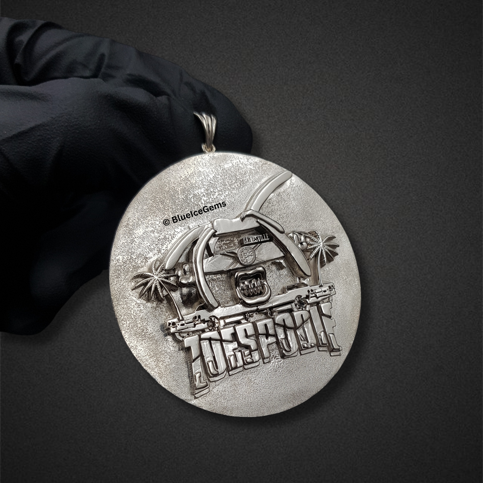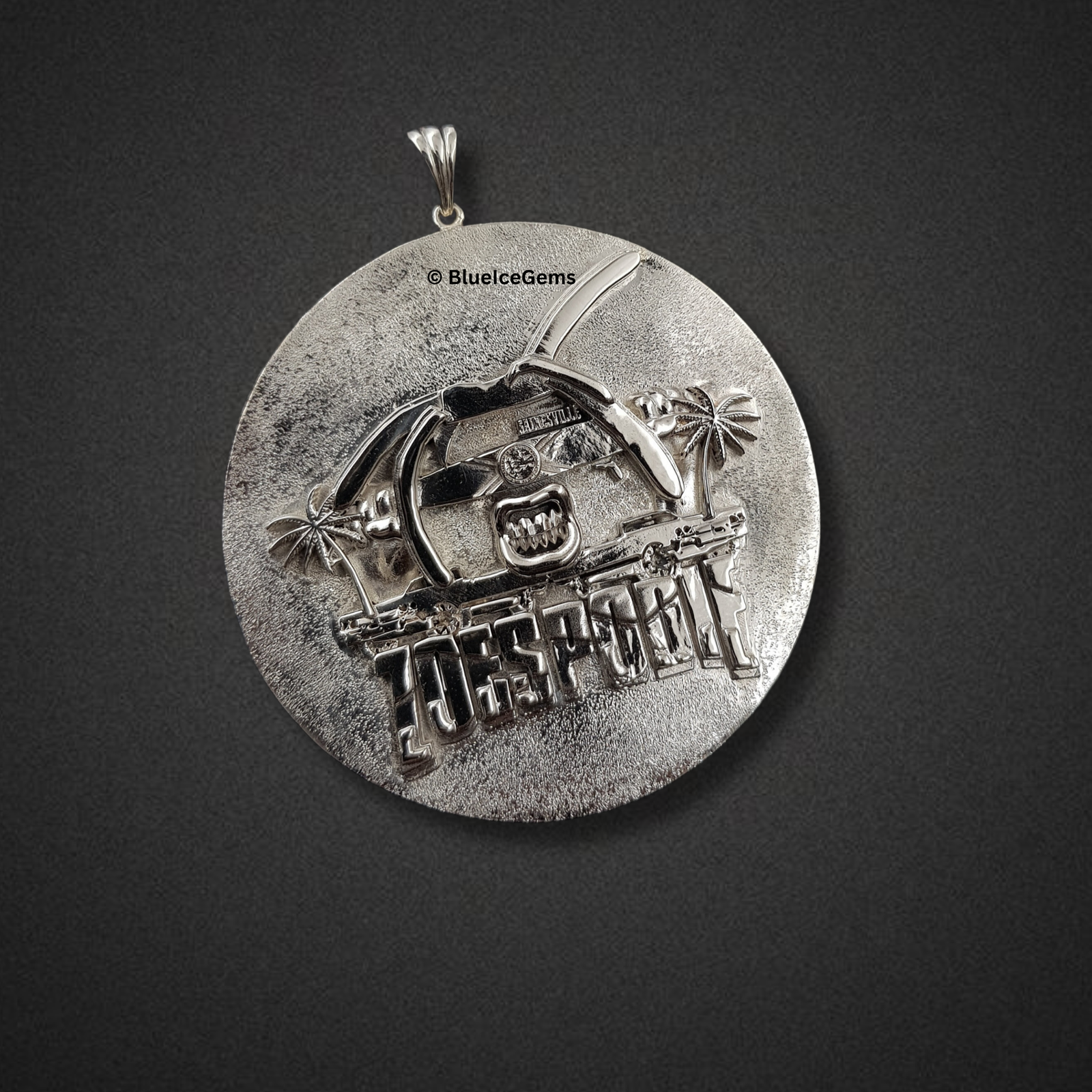 This striking circular medallion is a testament to intricate craftsmanship, rendered entirely in gleaming, highly polished silver. Its surface features a detailed, raised relief depicting a beach scene complete with palm trees and a swimming pool, all encompassed within its round frame. Boldly inscribed across the bottom is the word “ZOESPODIE,” creating a unique and personalized emblem. The contrasting textures of the polished surface and the sculpted elements reflect light beautifully, emphasizing the artistry of the design. This substantial medallion is a perfect statement piece for those who cherish memories of leisure, community, or a specific location. The integrated bail ensures a secure and elegant display on your chosen chain, making it a versatile and cherished accessory.